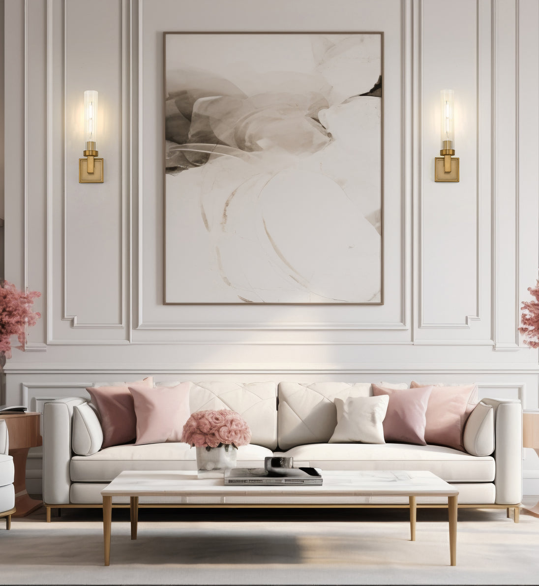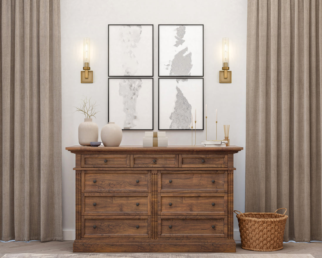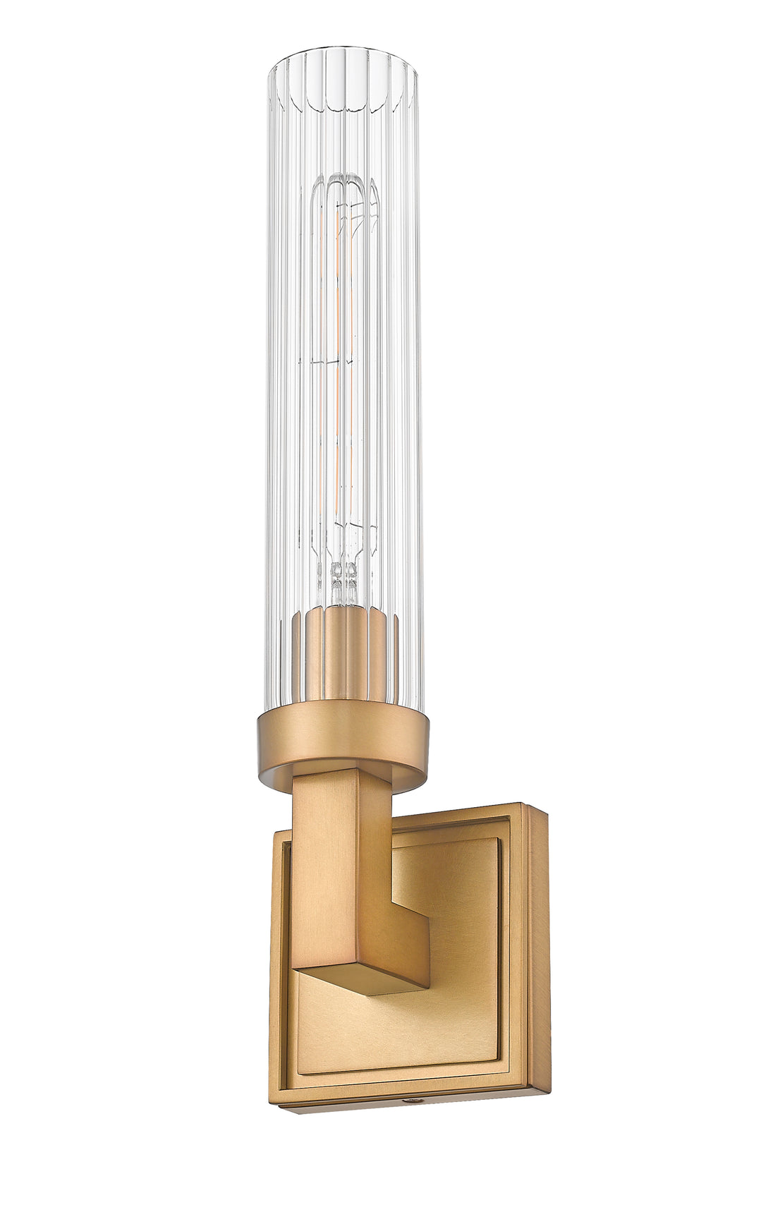 The depth and richness of a rubbed brass finish create excellent warmth for this modern one-light wall sconce. Its simple structure features a square wall plate and a wide arm, with a cylindrical shade. Clear ribbed glass diffuses light, delivering brightness with plenty of sophisticated dimensionality.