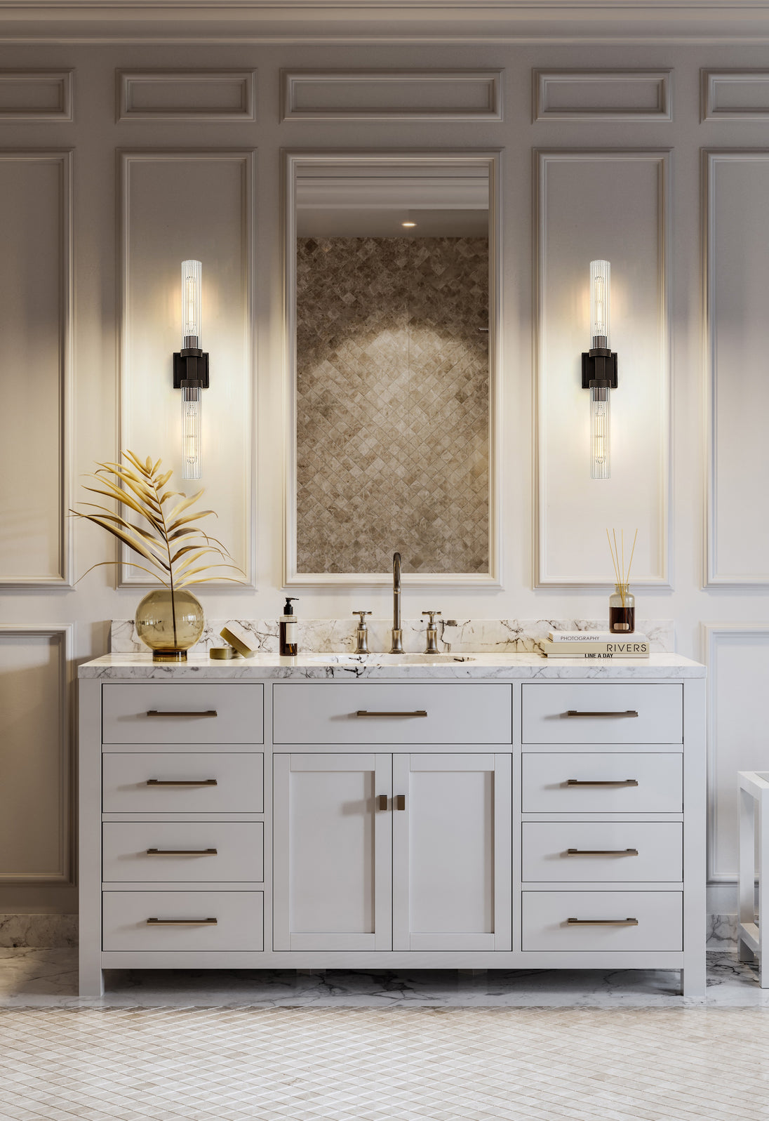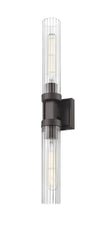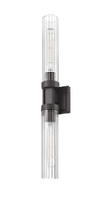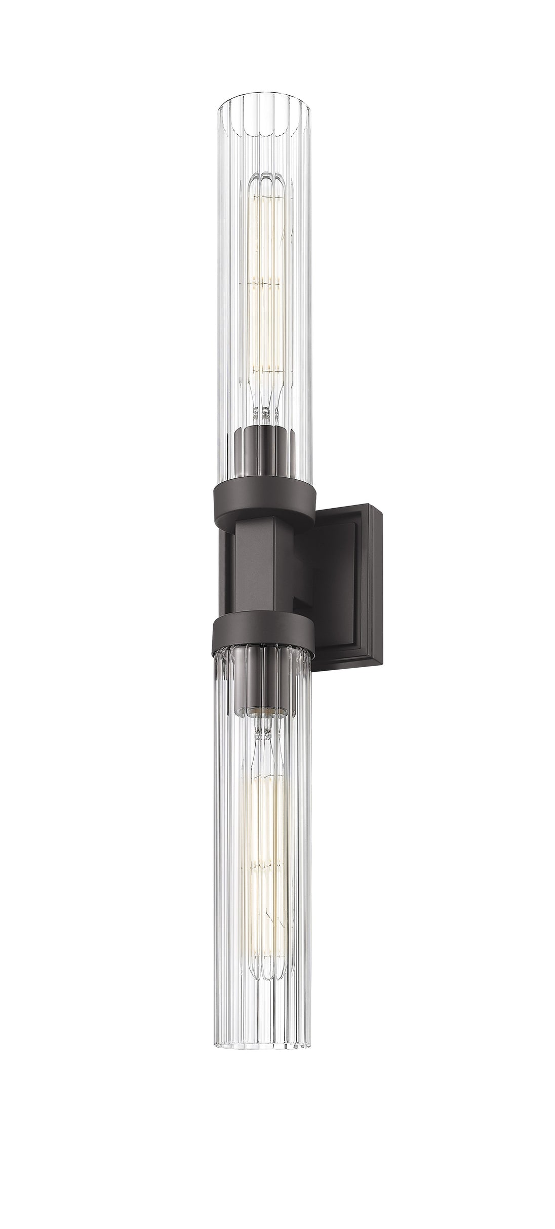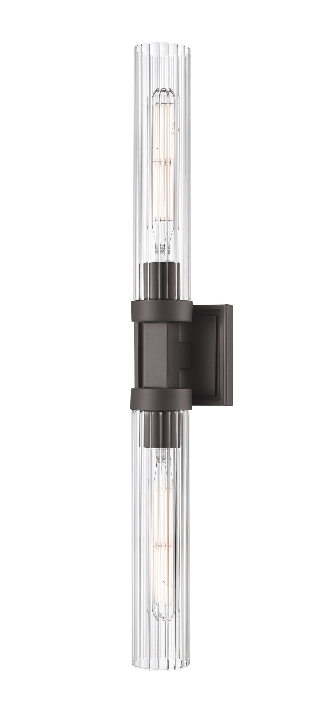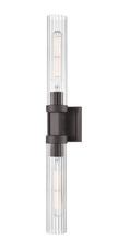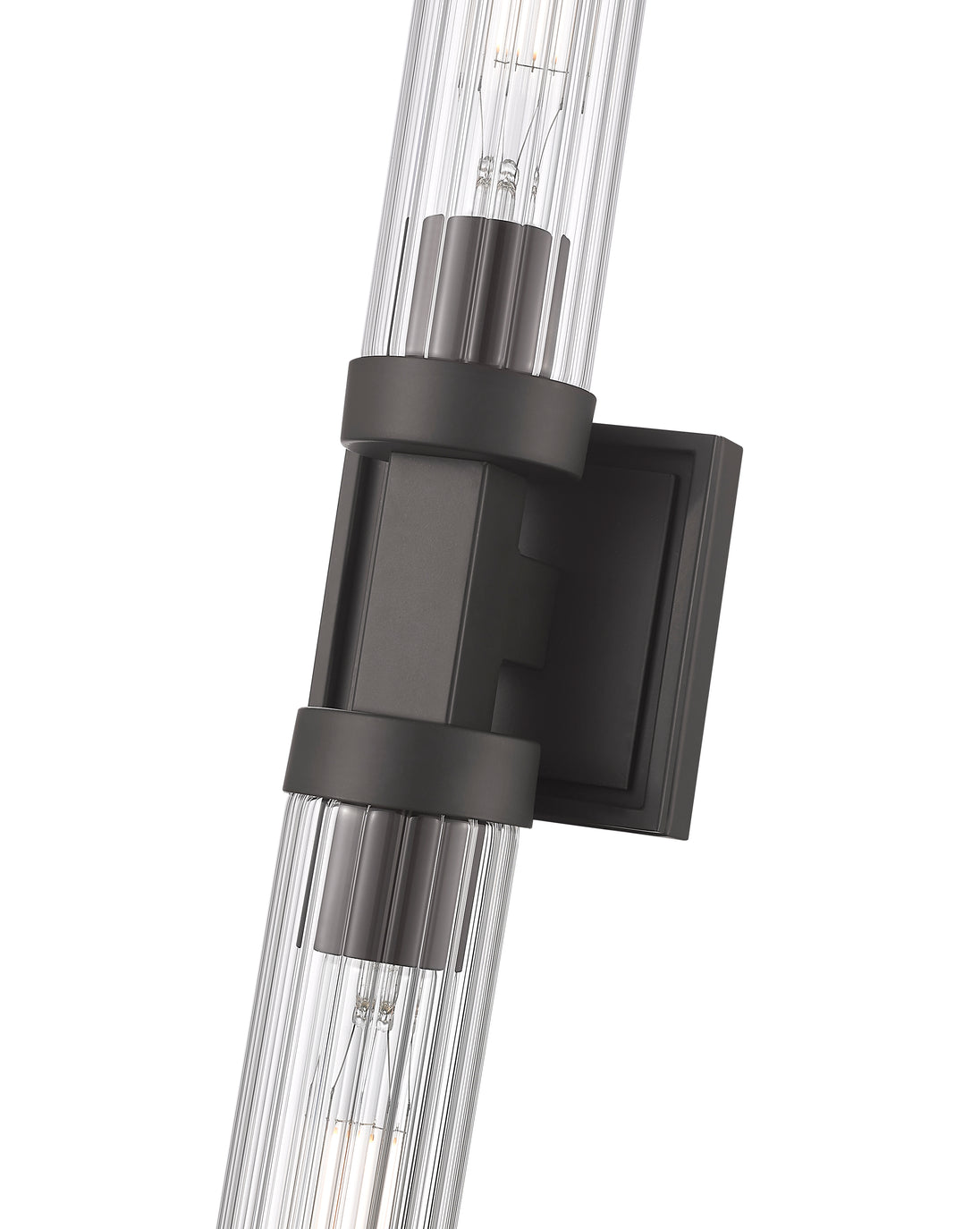 Rich, warm bronze sets the tone for a modern two-light wall sconce. Its double-ended design creates a linear profile, offering excellent style and lighting at the vanity or in your living spaces. Its slim, cylindrical shades are crafted in a delicate fluted glass, adding radiance and sophistication.