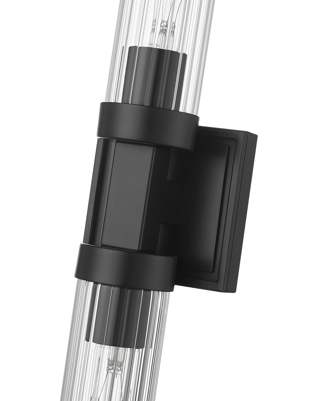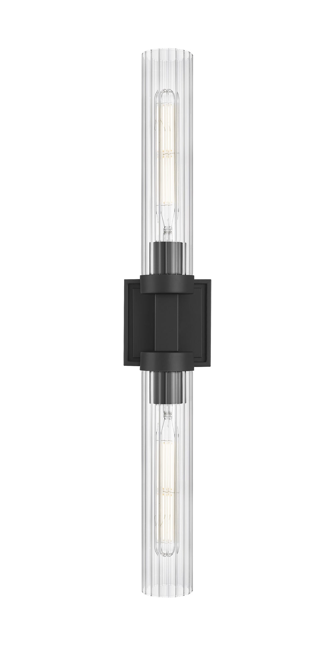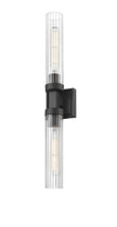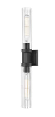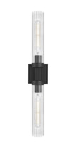 A matte black finish pairs perfectly with the delicate fluted clear glass shades featured on this modern two-light wall sconce. Designed with a linear silhouette and lights on each side of a decorative arm, it offers a refined personality in an entry or at your vanity.