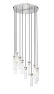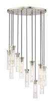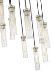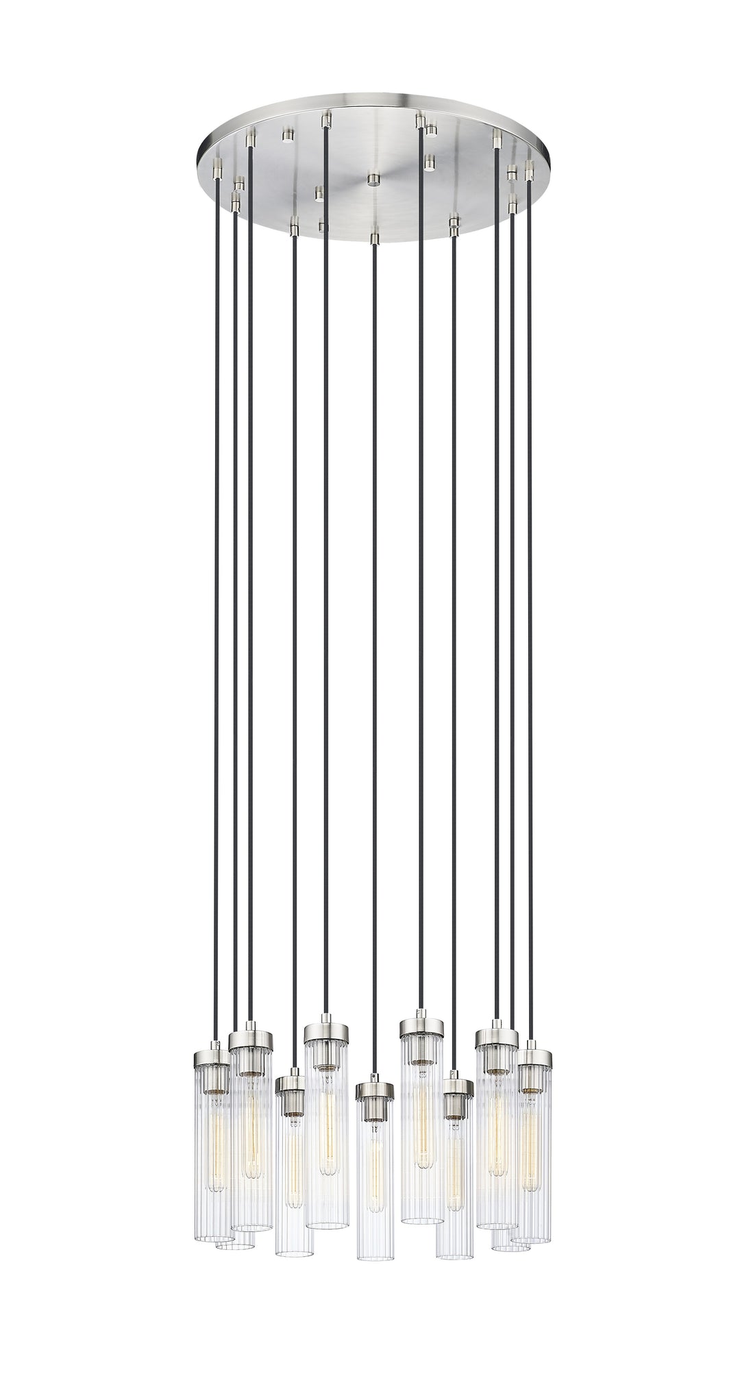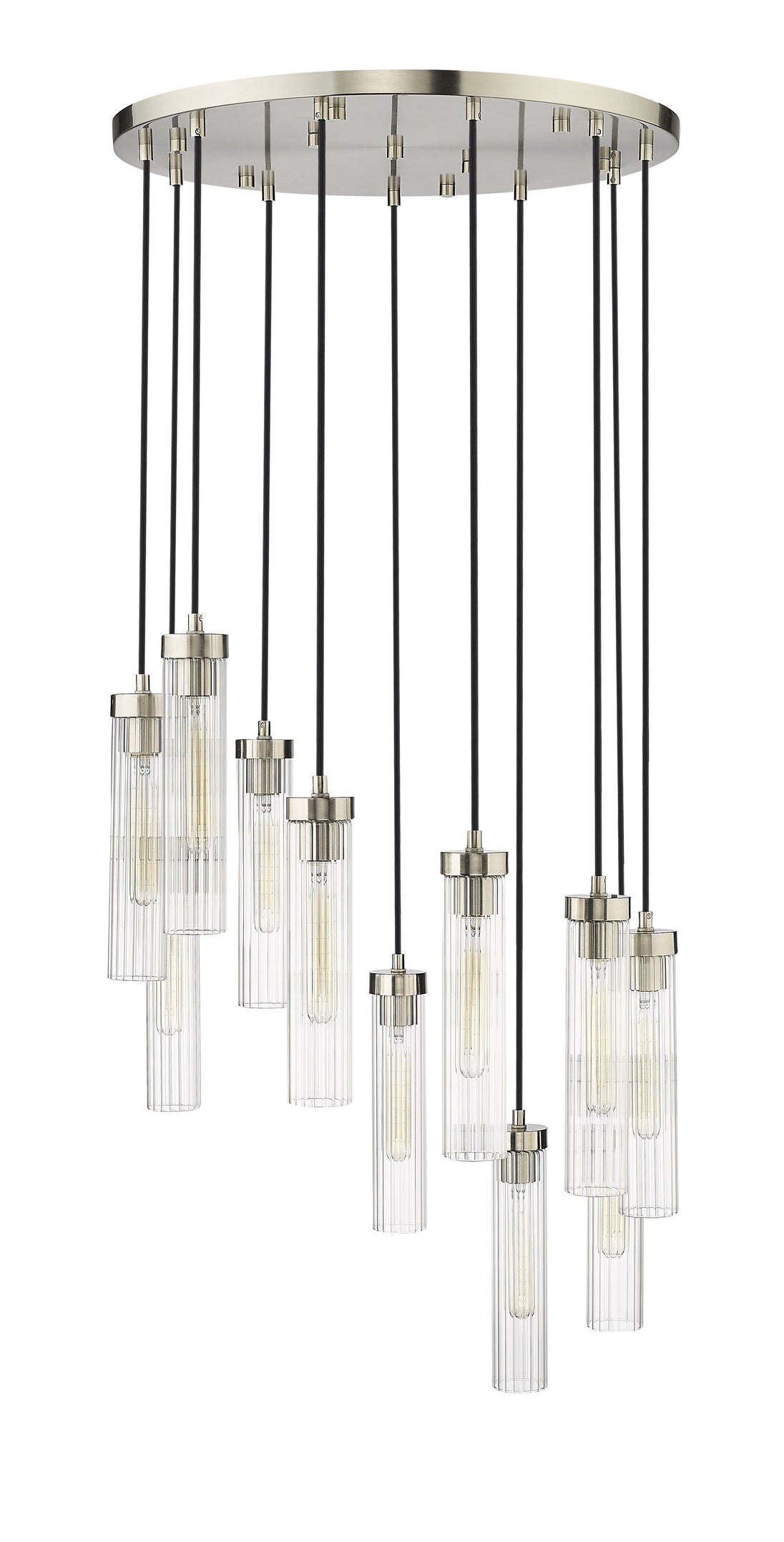 An enticing mix of fine art and sophistication completes the glam look of an eleven-light chandelier created for impact. A rounded cluster of delicate fluted glass shades is both chic and minimalist, offering pure organic inspiration. Highlight a nook or reading space with this exquisite chandelier accented with a brushed nickel finish metal canopy.