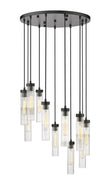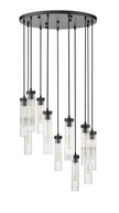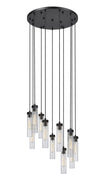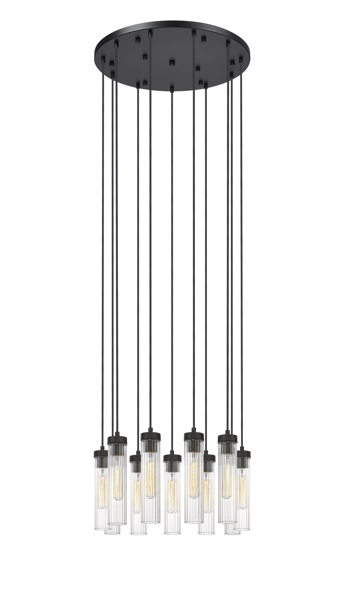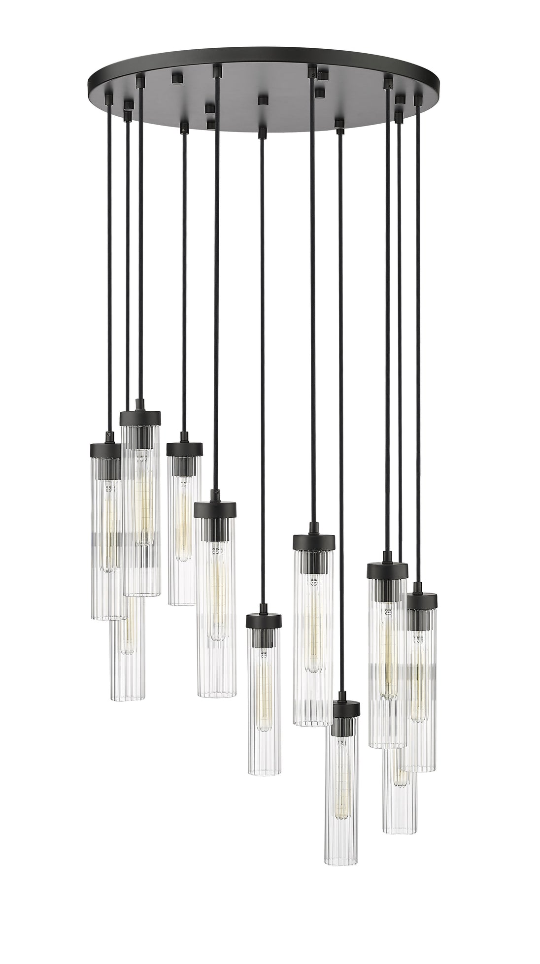 An enticing mix of fine art and sophistication completes the glam look of an eleven-light chandelier created for impact. A rounded cluster of delicate fluted glass shades is both chic and minimalist, offering pure organic inspiration. Highlight a nook or reading space with this exquisite chandelier accented with a bold matte black finish metal canopy.