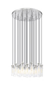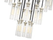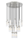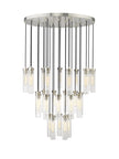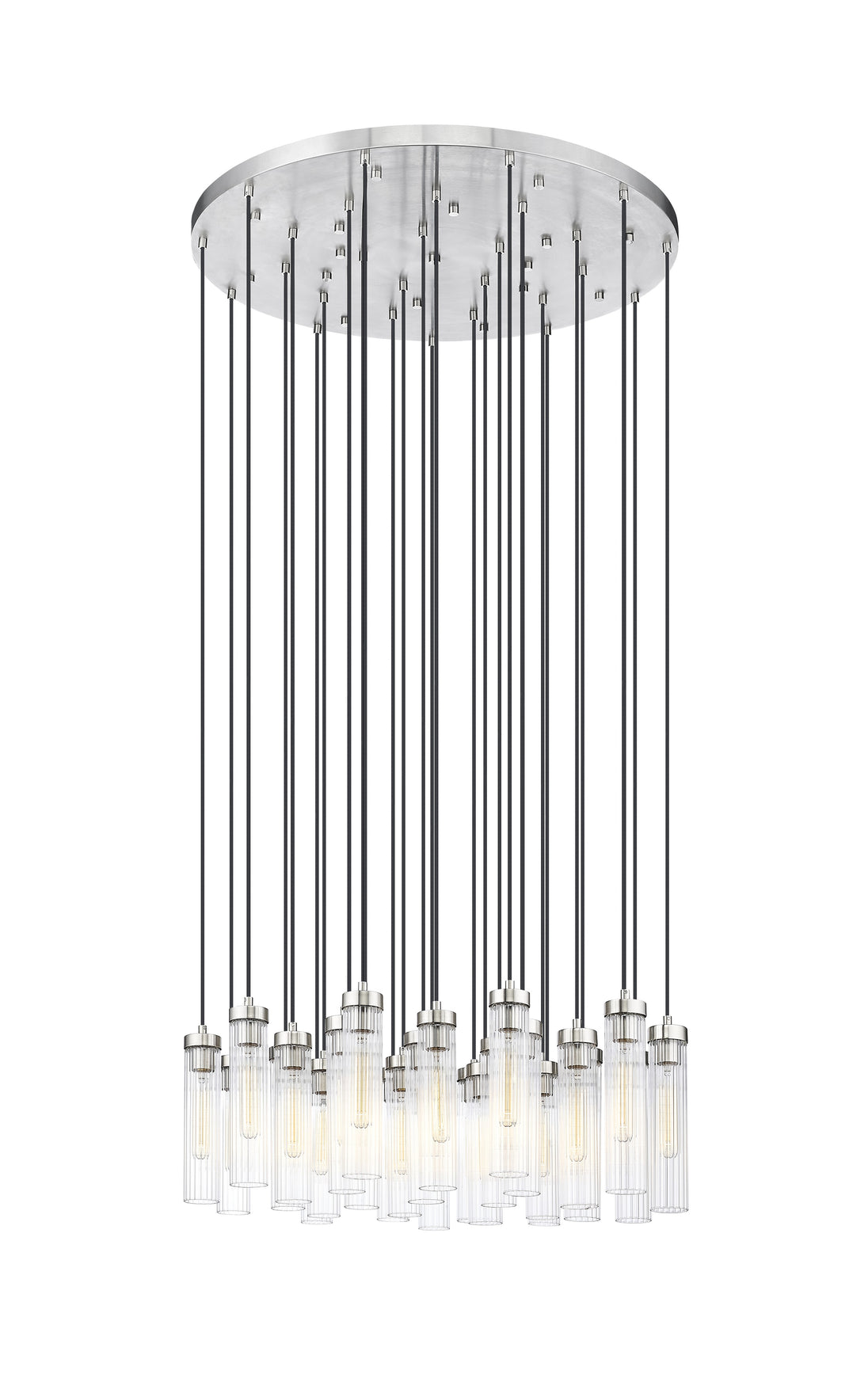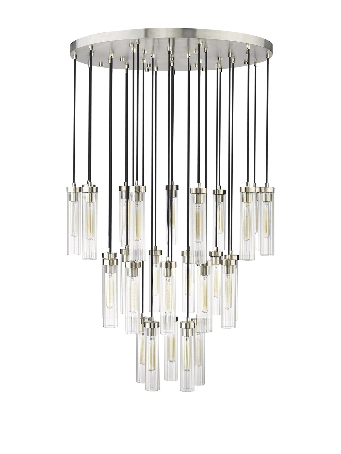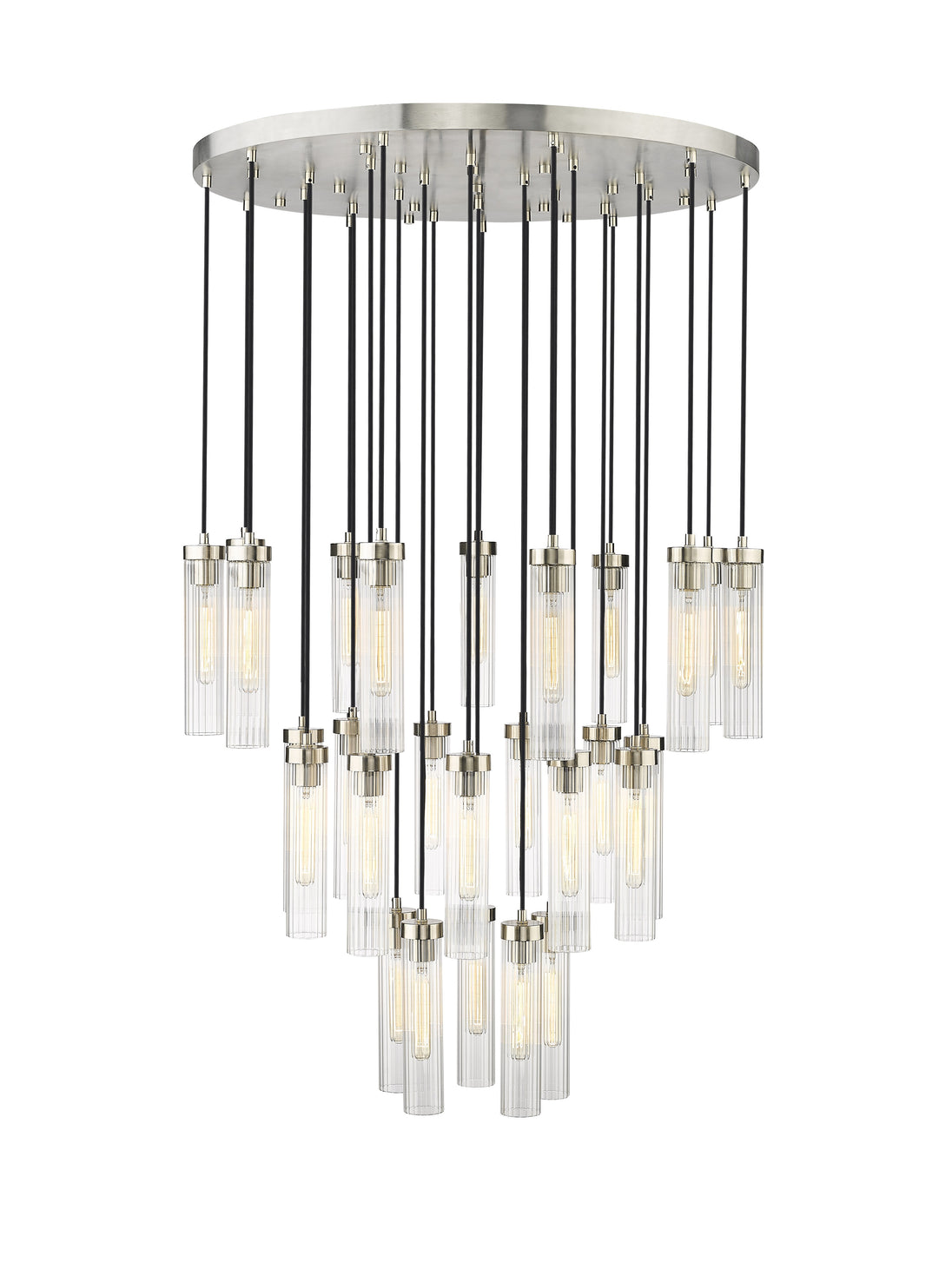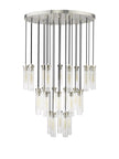 A circle of light casts radiant illumination and a glam-inspired flavor in a modern space as this 27-light round chandelier breathes life into custom living spaces. A cluster of subtly graduated, delicate fluted glass shades dangle from a cool brushed nickel finish round metal canopy and form an example of organic expressive style.