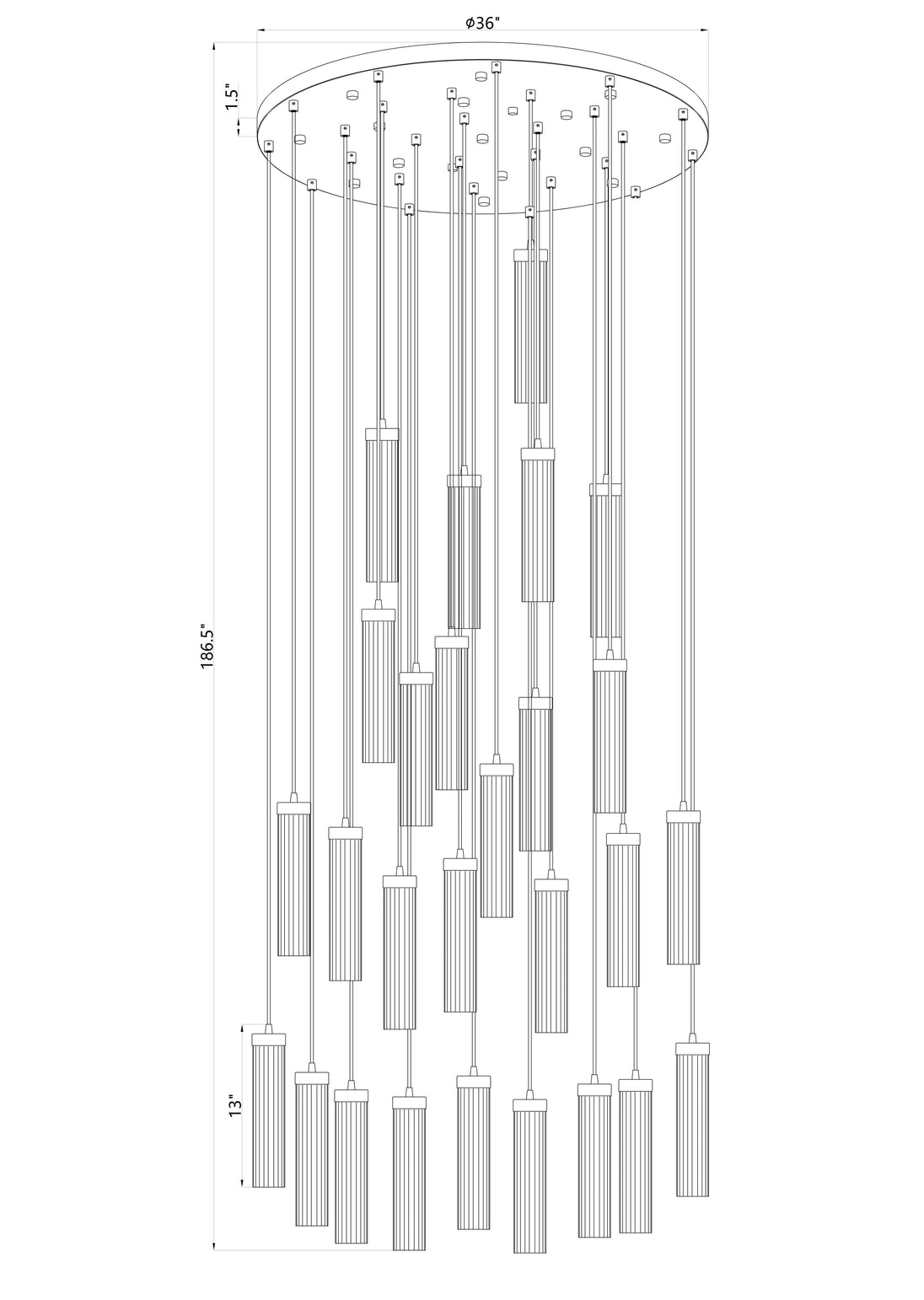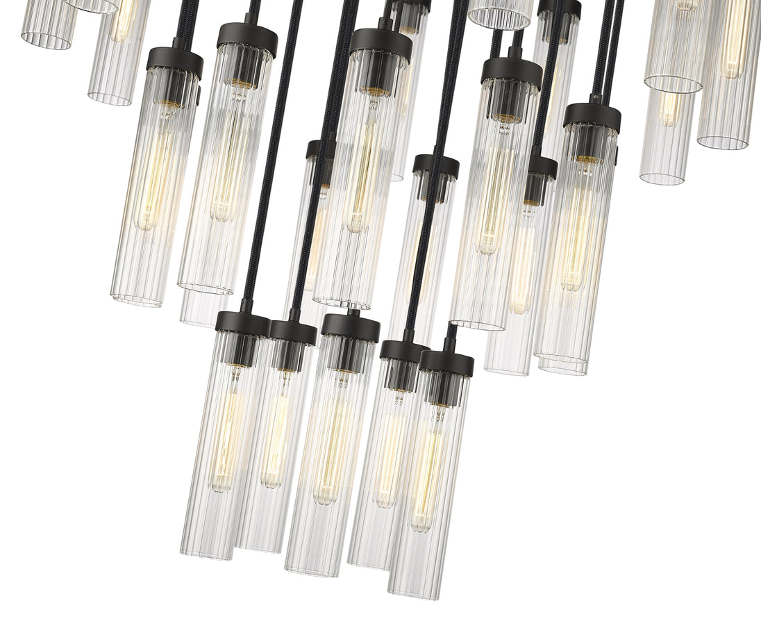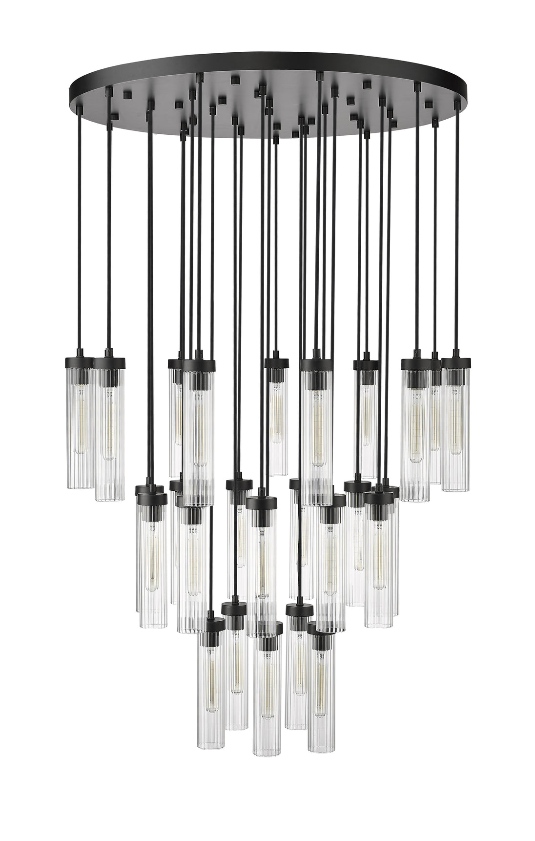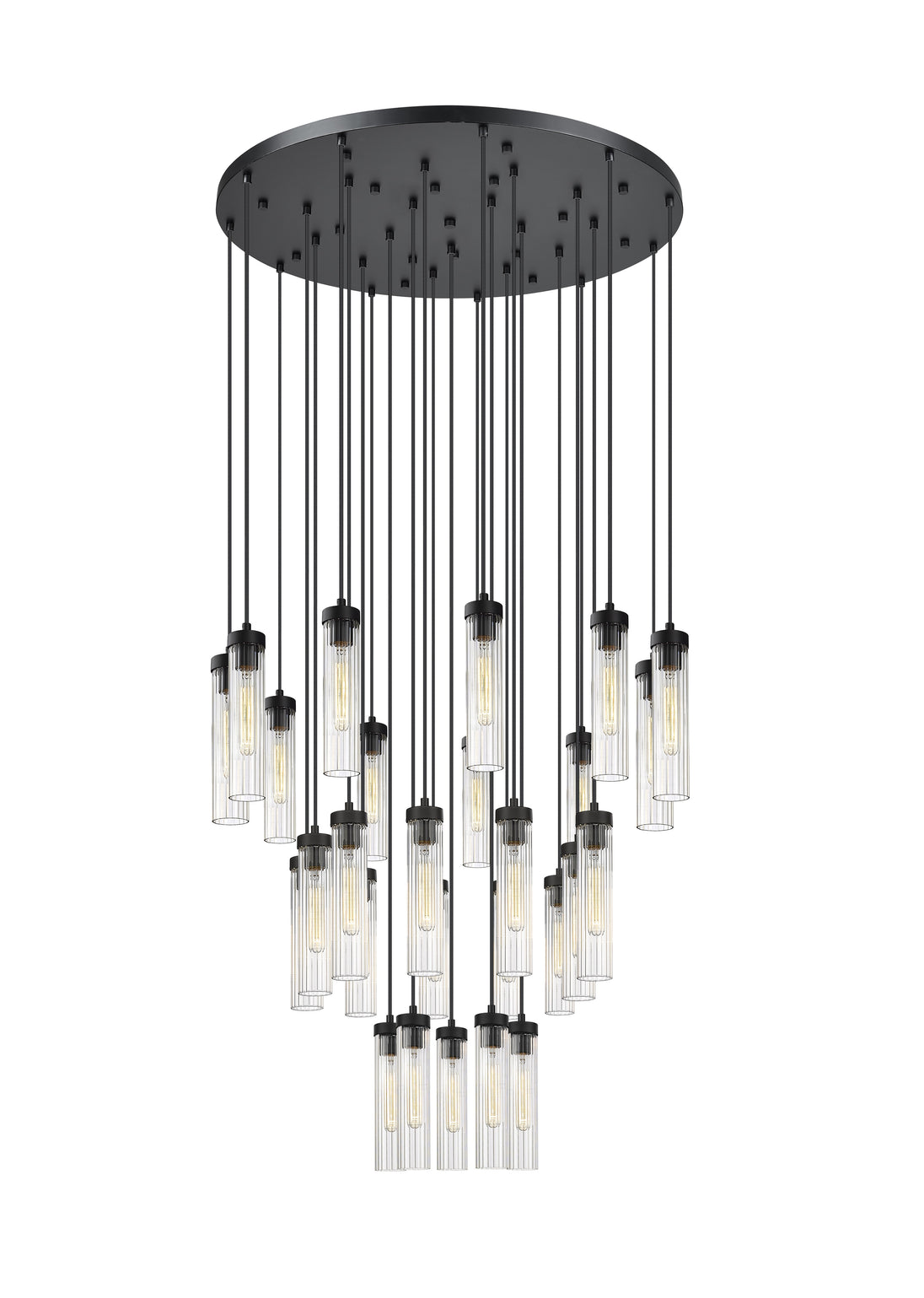 A circle of light casts radiant illumination and a glam-inspired flavor in a modern space as this 27-light round chandelier breathes life into custom living spaces. A cluster of subtly graduated, delicate fluted glass shades dangle from a bold matte black finish round metal canopy and form an example of organic expressive style.