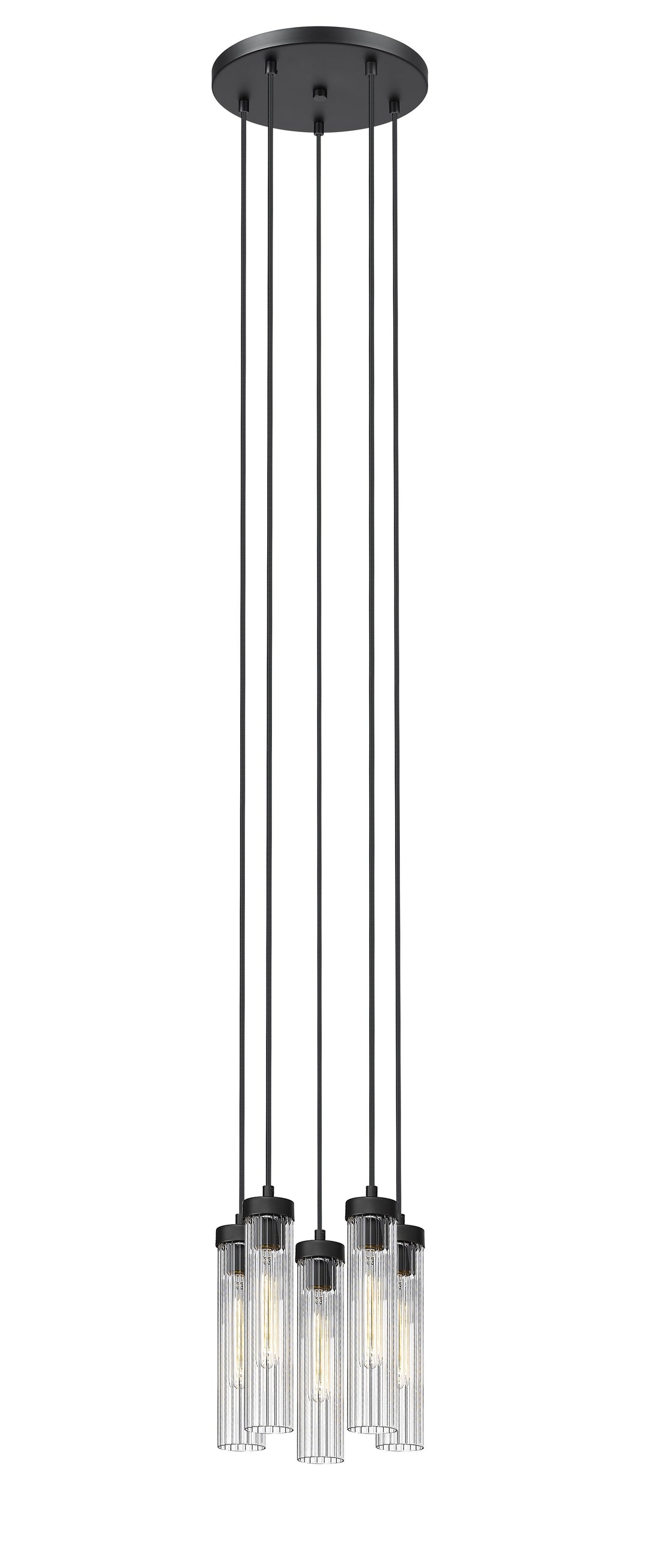 Iconic elegance is formed of a marriage between metal and glass shows gallery influence in this five-light round chandelier. Embrace the artisan glam and minimalist sensibility of a fixture featuring delicate fluted glass shades that dangle at graduated lengths from a bold matte black finish metal canopy and contribute optical intrigue. This tasteful chandelier serves as a pendant for compact spaces including nooks, enclaves, and entryways.