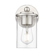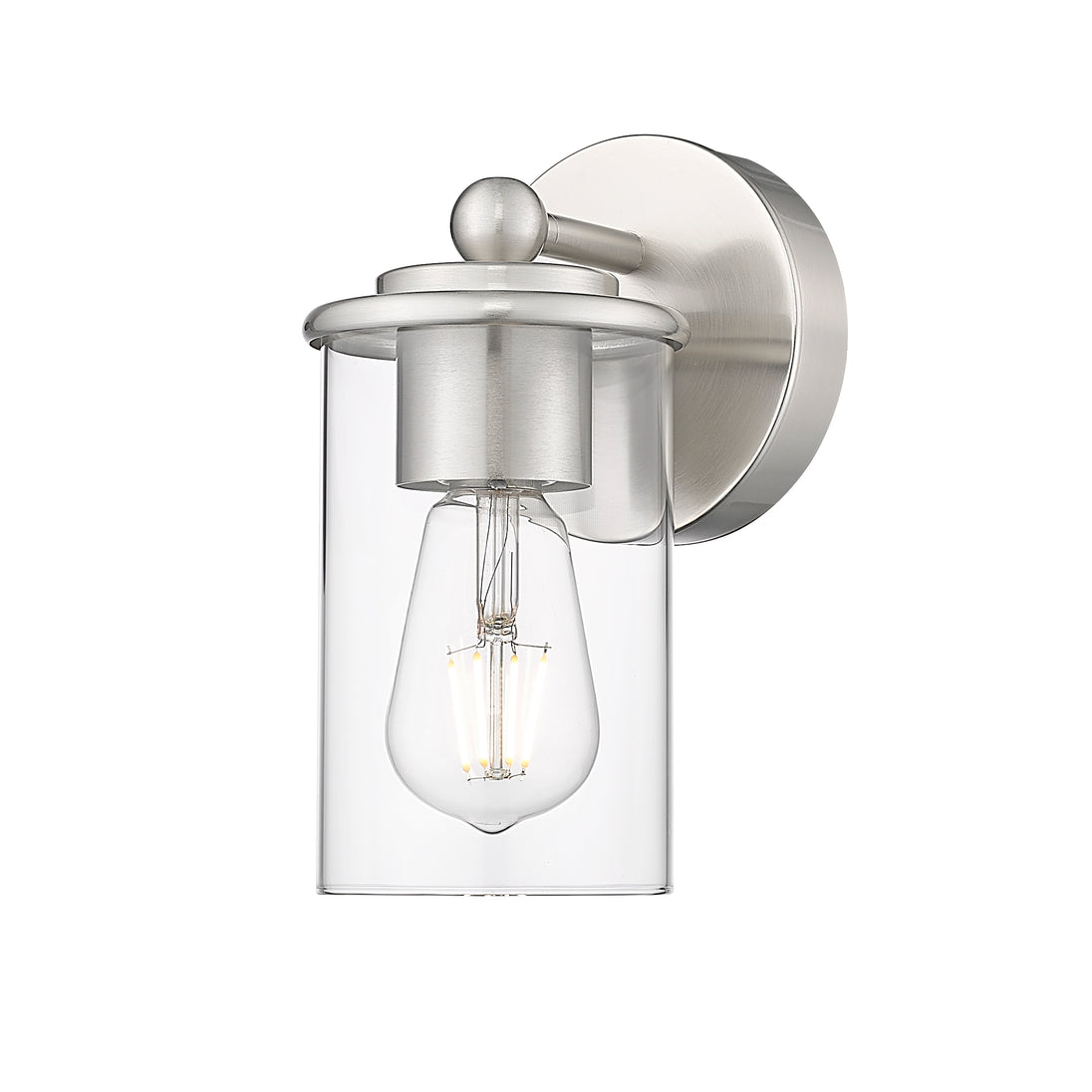Brighten your vanity or hall with the impeccable illumination and modern style of a contemporary one-light wall sconce. A cylinder of clear glass provides direct illumination, perfect for tasks and ambiance, while a brushed nickel finish frame adds decorative detail and depth in a modern bathroom or living area.