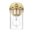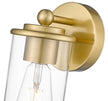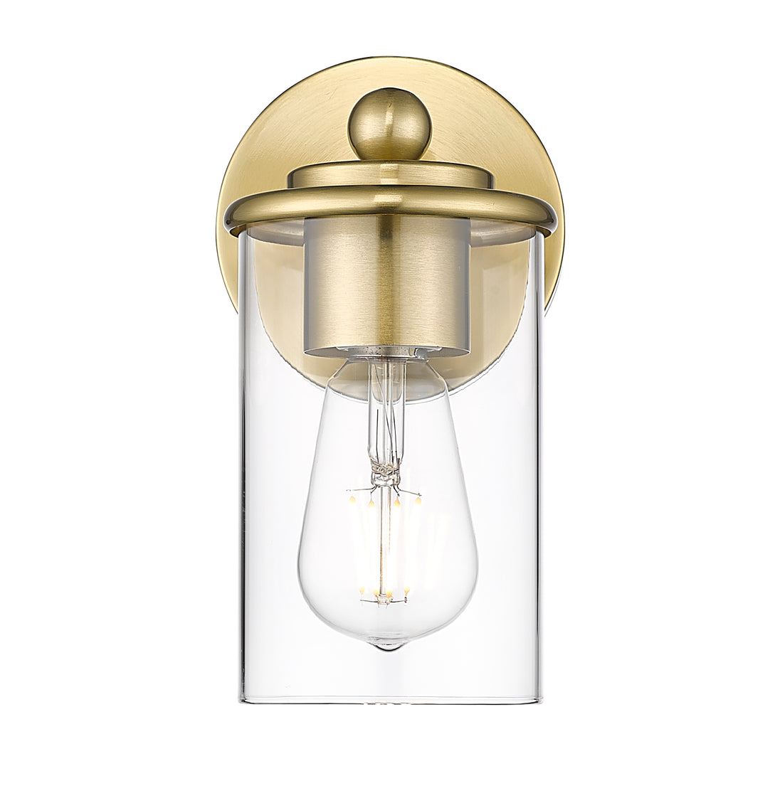 Brighten your vanity with the impeccable illumination and modern style of a contemporary one-light wall sconce. A cylinder of clear glass provides direct illumination, perfect for tasks and ambiance, while a rich luxe gold finish frame adds decorative detail and depth in a modern bathroom or living area.