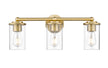Smooth curves and understated design collide to create a striking silhouette for a Thayer modern three-light vanity fixture. Beautiful over a sink or brightening a free-standing vanity, this gorgeous fixture features a rich luxe gold finish paired with clear glass that provides bright, true illumination for everything from shaving to putting on makeup in the morning. This three-light design is ideally sized for a medium vanity or single sink.