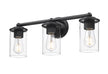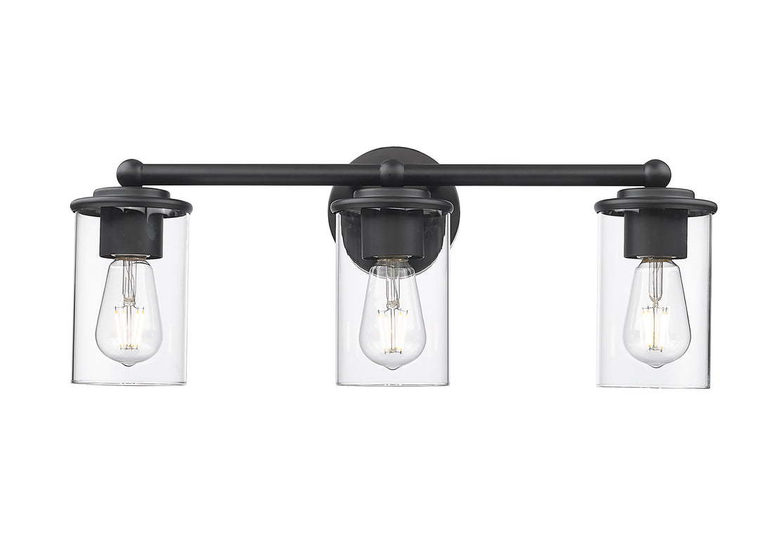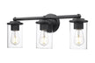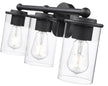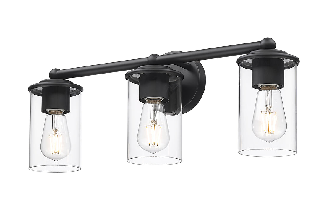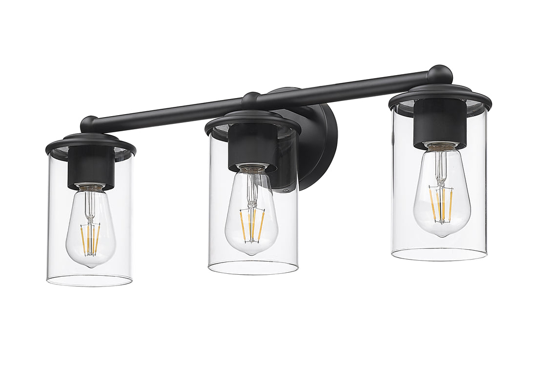 Smooth curves and understated design collide to create a striking silhouette for a Thayer modern three-light vanity fixture. Beautiful over a sink or brightening a free-standing vanity, this gorgeous fixture features a distinctive matte black finish paired with clear glass that provides bright, true illumination for everything from shaving to putting on makeup in the morning. This three-light design is ideally sized for a medium vanity or single sink.