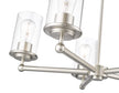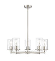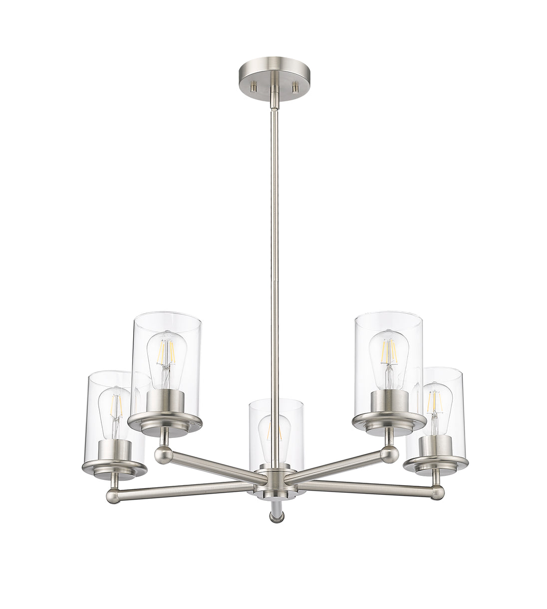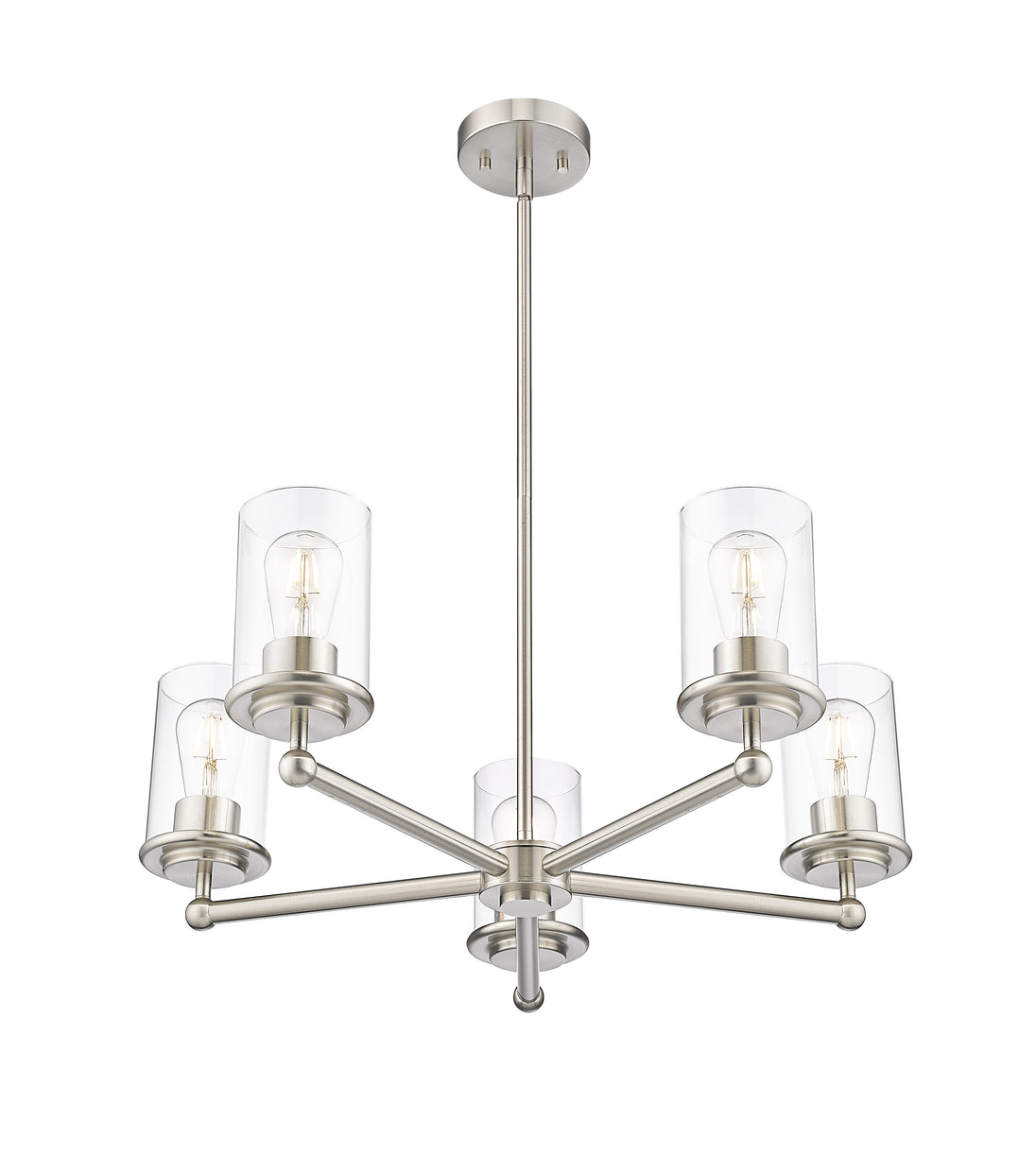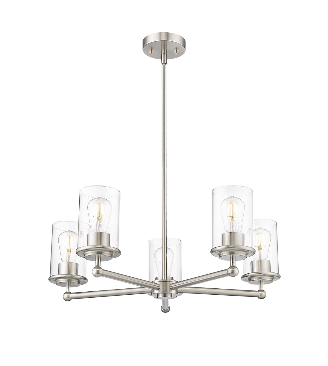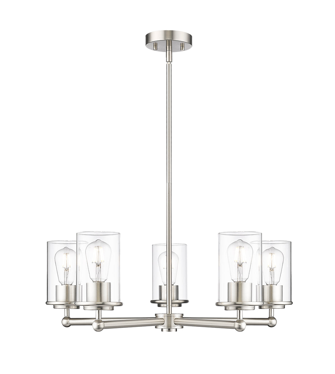 Complete a timeless kitchen or living area with the understated flair of a modern five-light chandelier from the impeccable Thayer collection. Clean lines and gentle curves highlight its silhouette, with cylinders of smooth, clear glass surrounding each light and offering a light, airy ambiance over a breakfast nook or entryway. A classic brushed nickel finish adds the perfect touch of sleek sophistication.