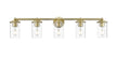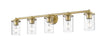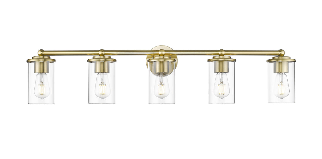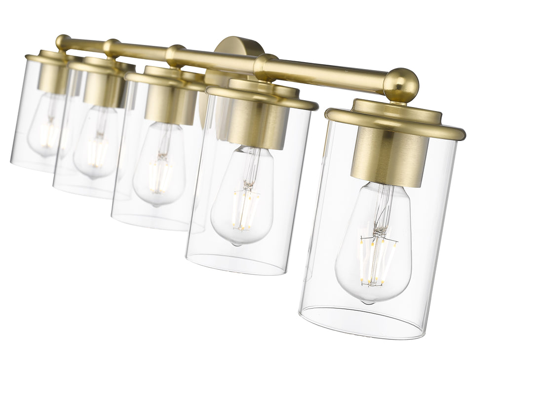 Span a large vanity with the impressive illumination of a five-light bath fixture. Its modern build features gentle curves and understated ambiance, brimming with elegance in a luxe gold finish that pairs perfectly with smooth, clear glass.