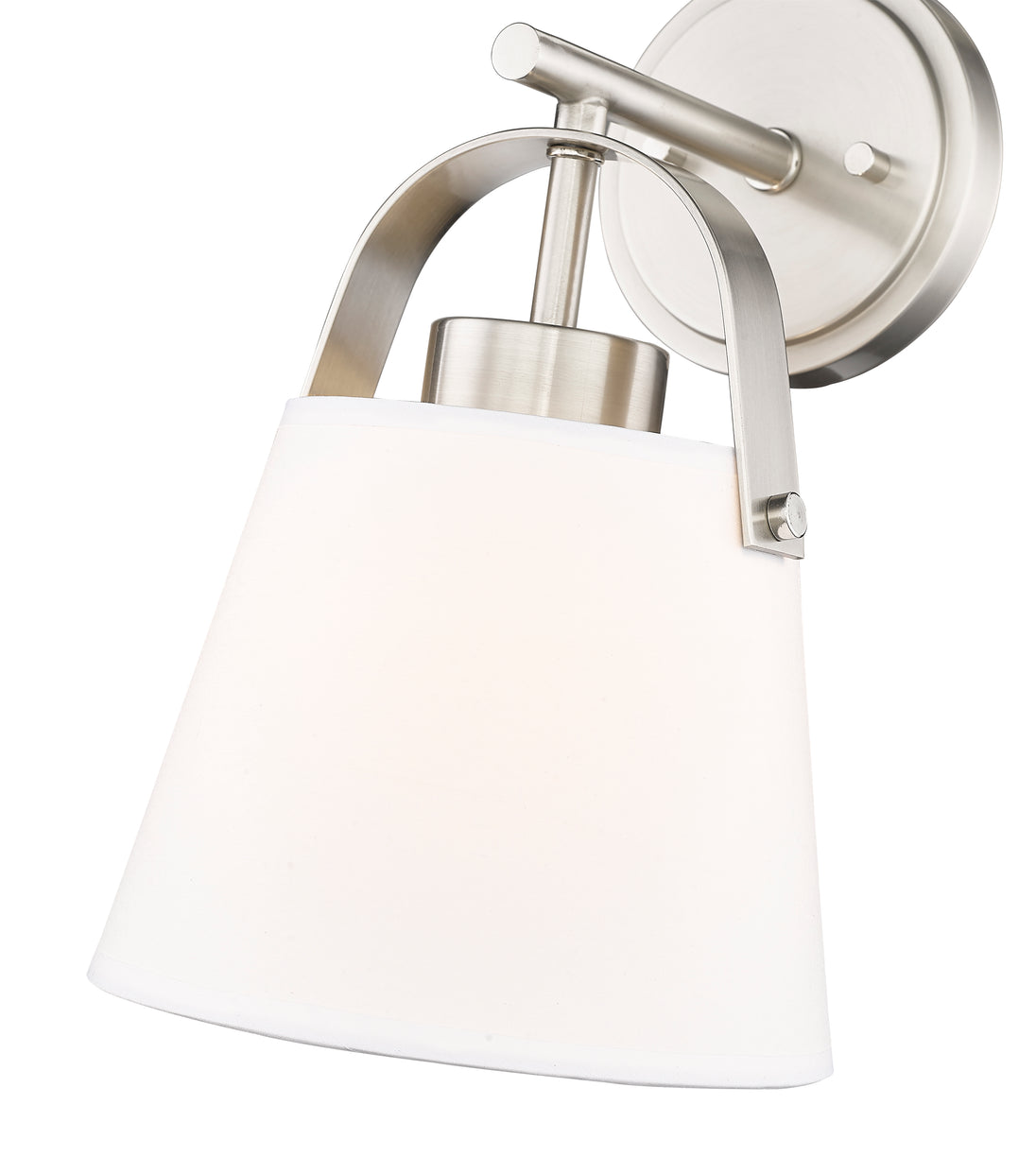 Weaving in a bit of nautical personality, this one-light pendant from the Z-Studio collection embodies versatility and charm. This fixture reflects a hint of farmhouse charm, coastal ease, and casual elegance all in one, with an open ivory fabric conical shade and ornate framing in brushed nickel finish steel. Explore possibilities in a casual living space with a wall sconce that embellishes an easy, carefree living space.