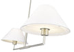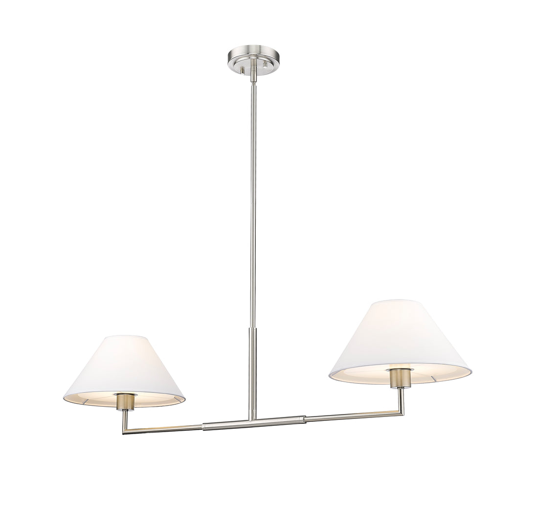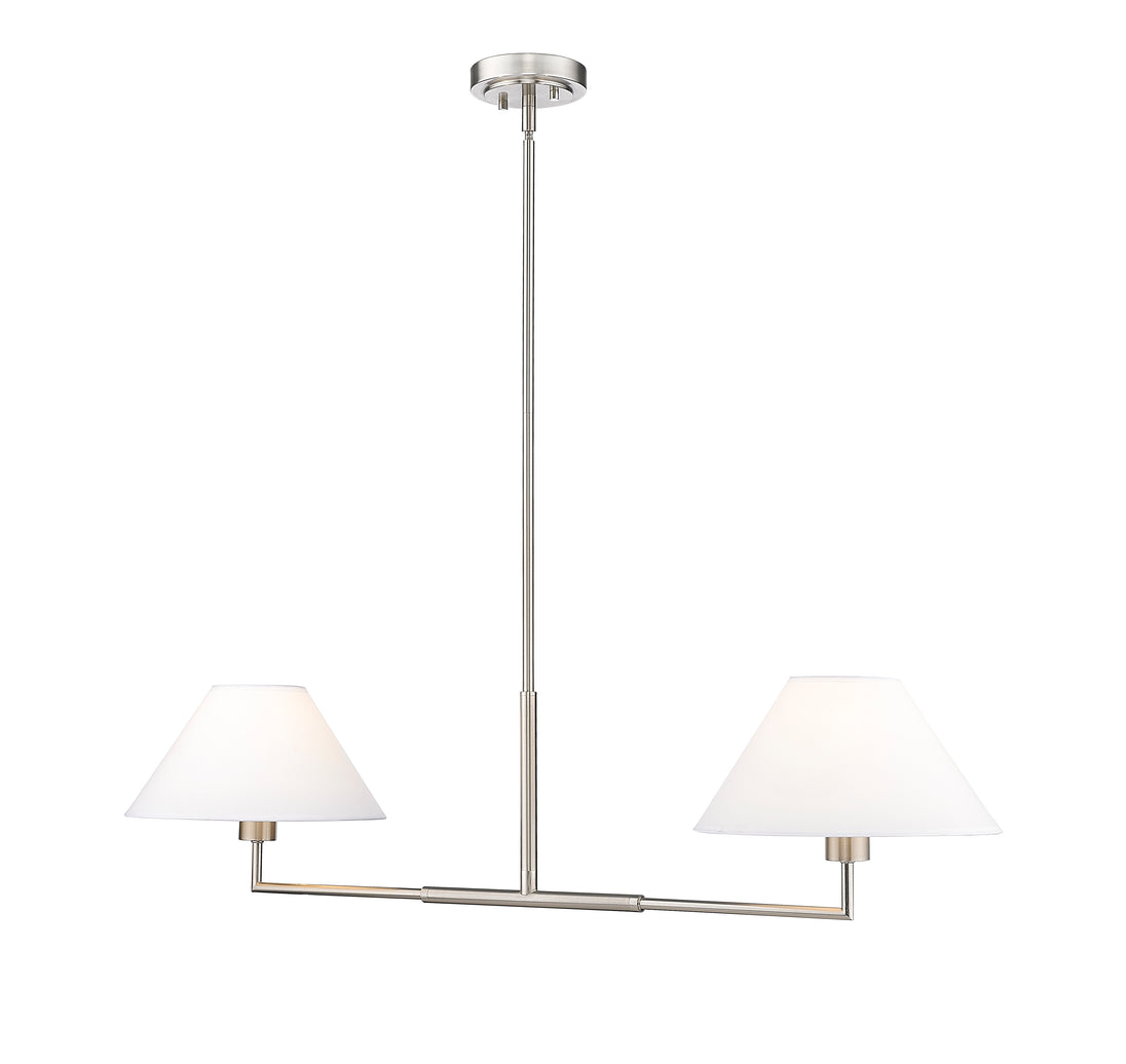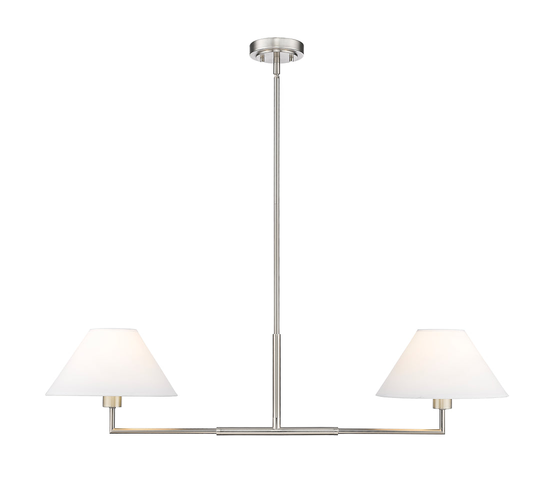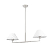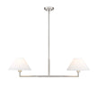 The power of modern simplicity is highlighted in a chic two-light linear chandelier that's equally impactful over a kitchen island as in your bedroom or living area. Its clean lines are accentuated with a crisp brushed nickel finish over steel construction, while a pair of white linen empire shades are beautiful and timeless in any room. Casting inviting illumination for tasks and ambiance, this chandelier is a stylish fit in myriad spaces.