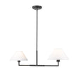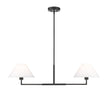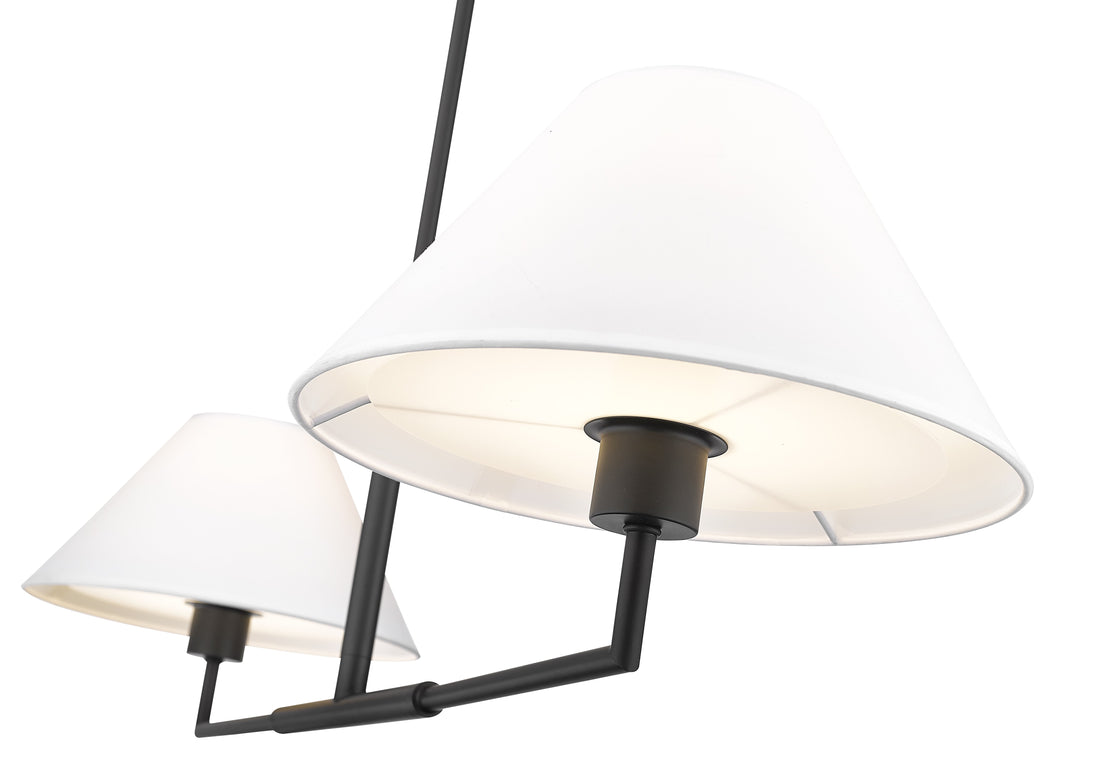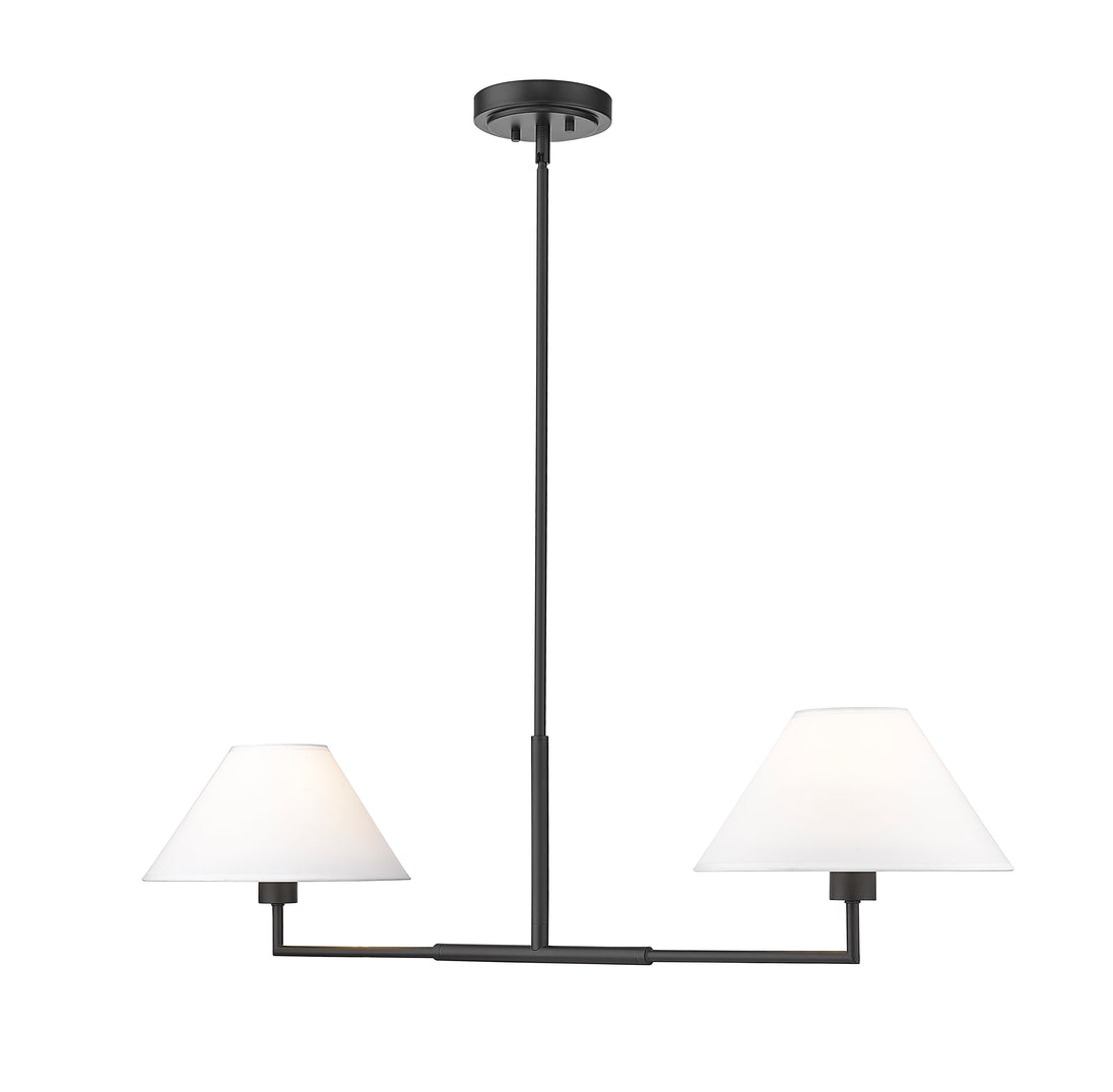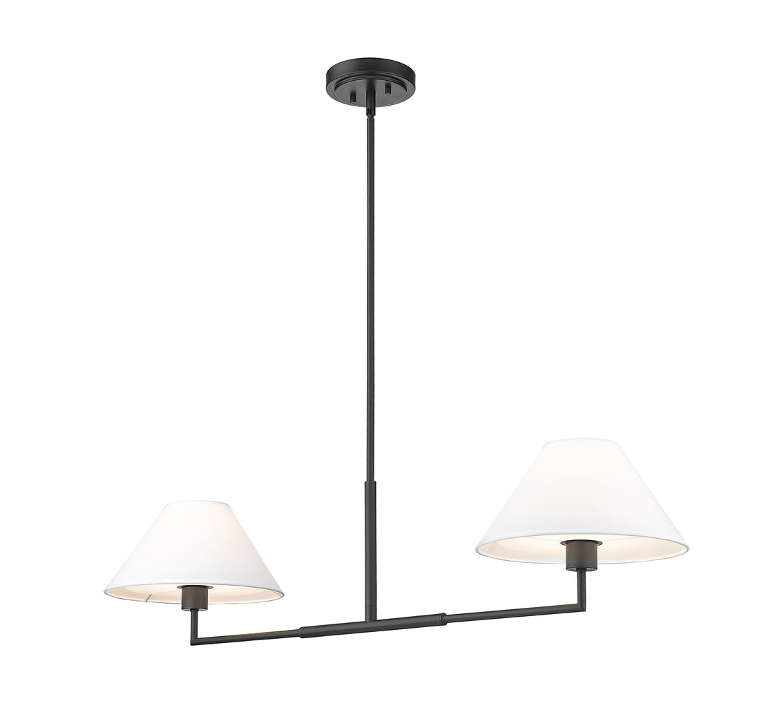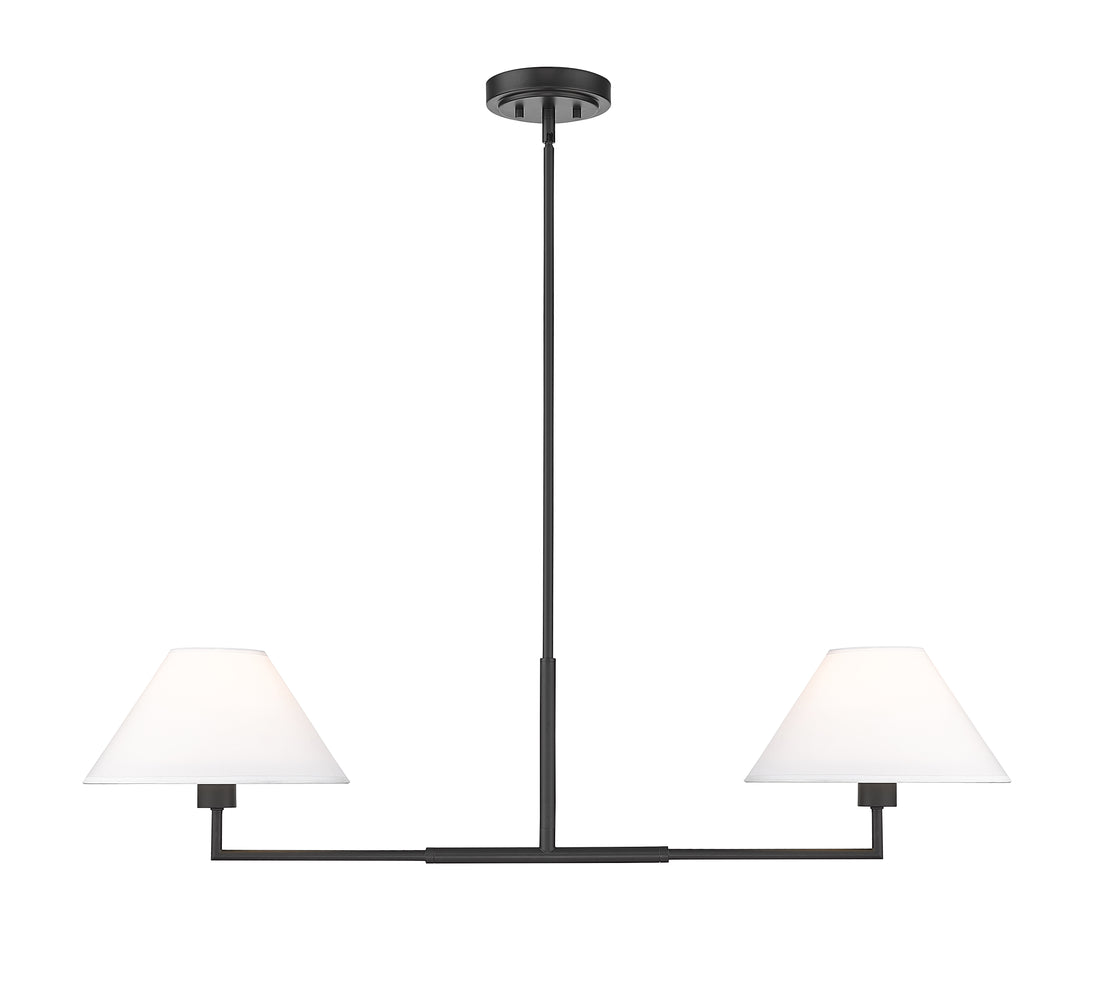 The power of modern simplicity is highlighted in a chic two-light linear chandelier that's equally impactful over a kitchen island as in your bedroom or living area. Its clean lines are accentuated with a crisp matte black finish over steel construction, while a pair of white linen empire shades are beautiful and timeless in any room. Casting inviting illumination for tasks and ambiance, this chandelier is a stylish fit in myriad spaces.