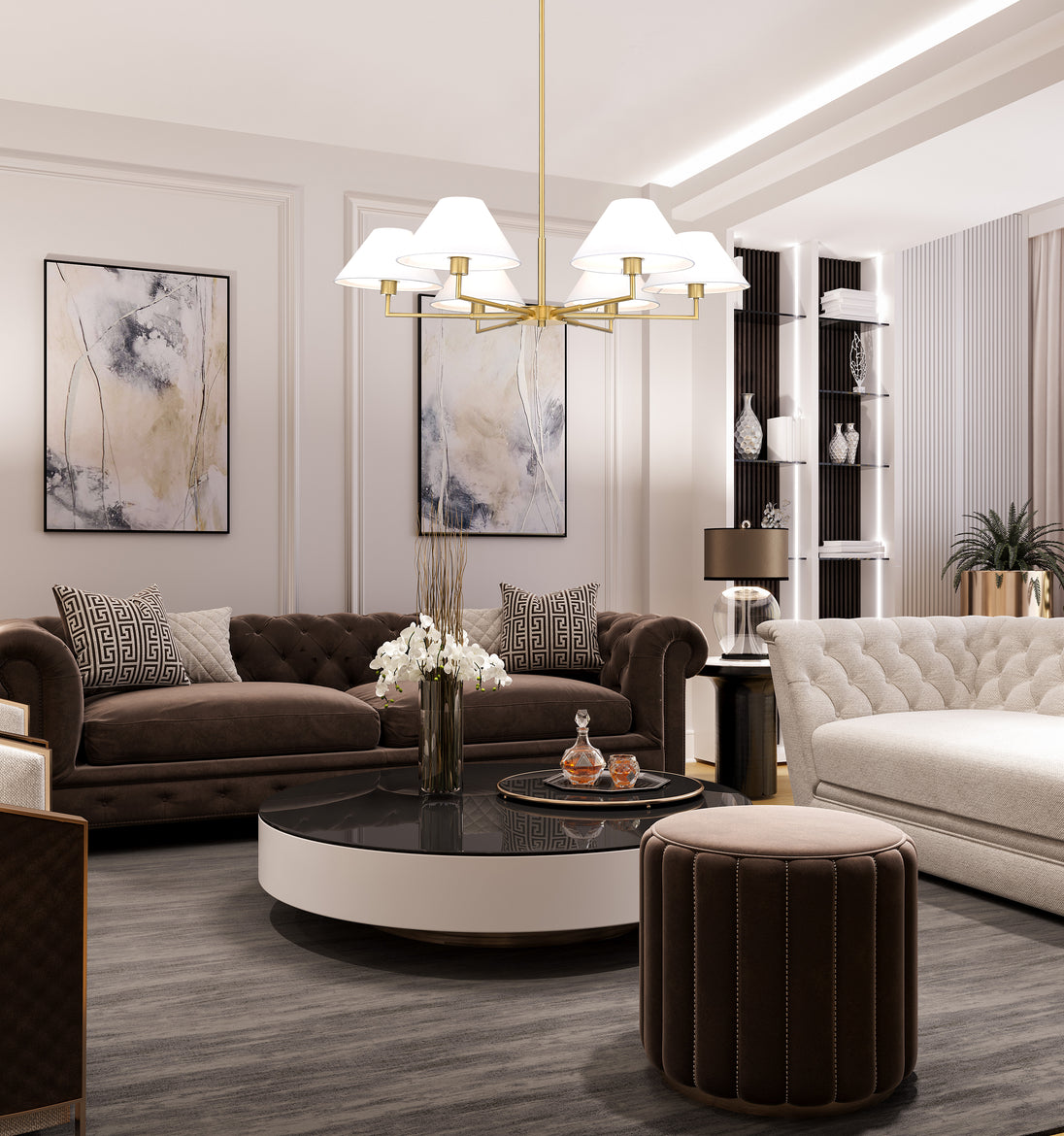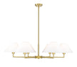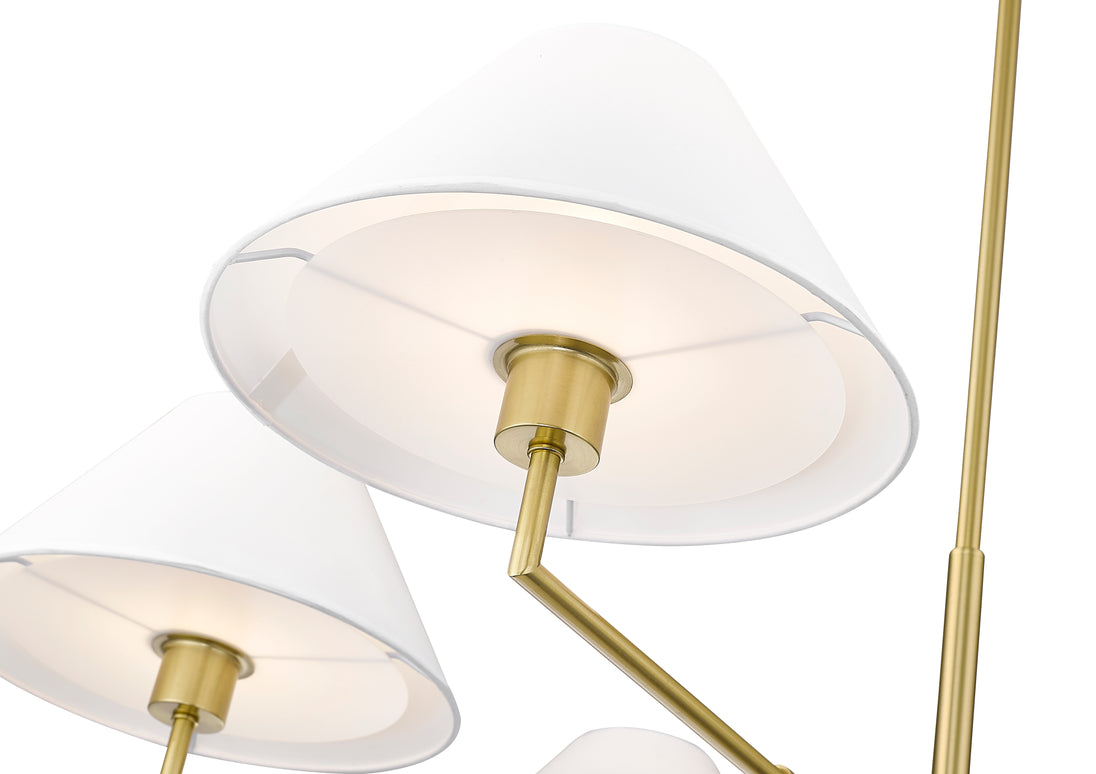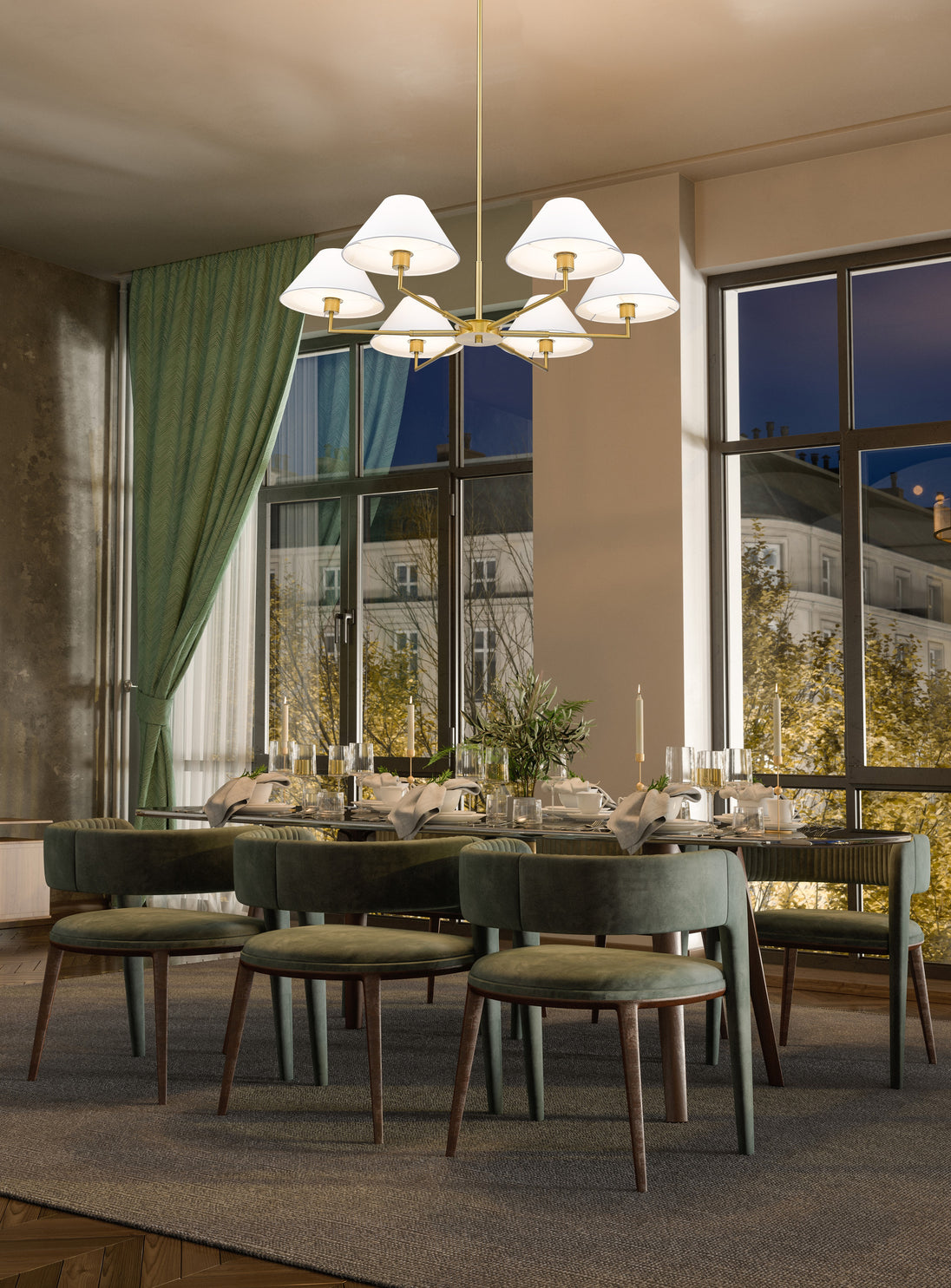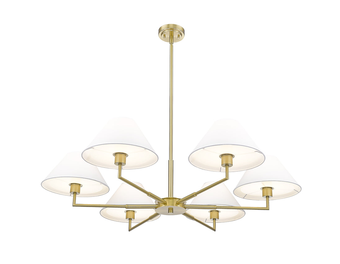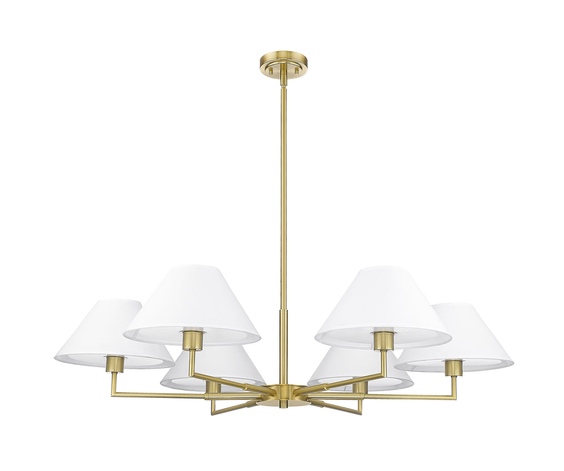 Inject a little modern simplicity into surrounding decor with a stylish six-light chandelier. In a gleaming luxe gold finish, this delightful fixture is a flexible option everywhere from your dining room to a master suite, casting warm, bright illumination while instilling radiant elegance. Its six lights are complete with empire shades for a classic touch updated with white linen for light, bright ambiance.