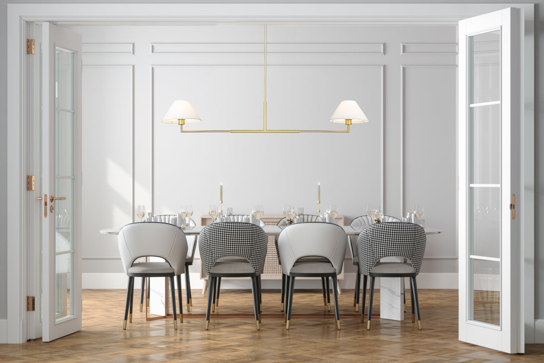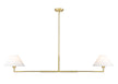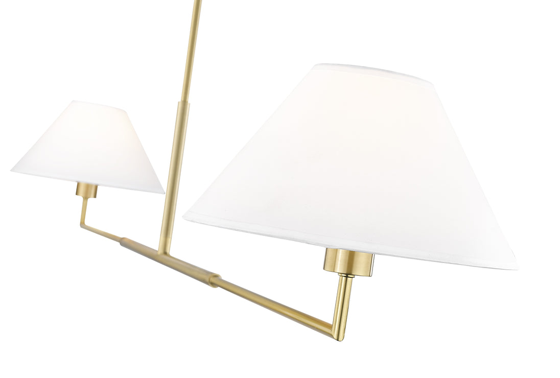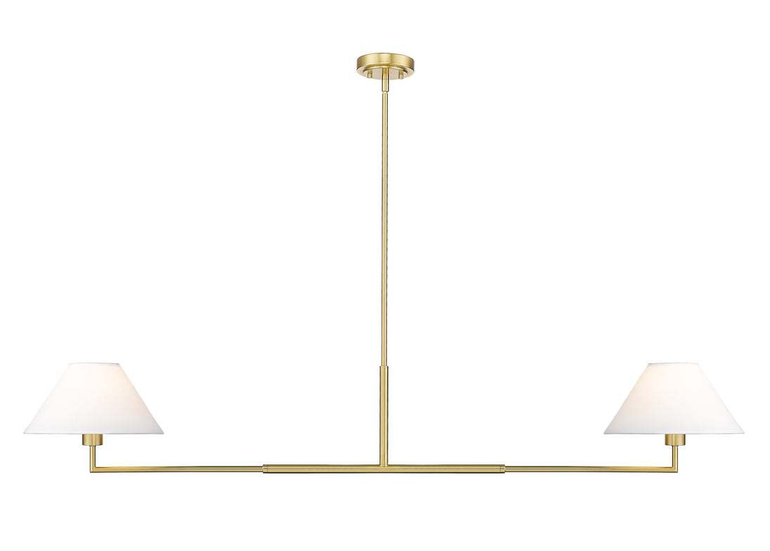 Highlighting modern simplicity and elegance, this chic two-light linear chandelier is stunning over a kitchen island or spanning a living room seating area. Its clean lines are accentuated with a warm luxe gold finish over steel construction, while a pair of white linen empire shades are beautiful and timeless in any room. Casting inviting illumination for tasks and ambiance, this chandelier is a stylish fit in myriad spaces.