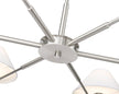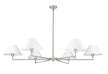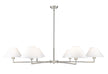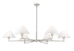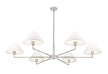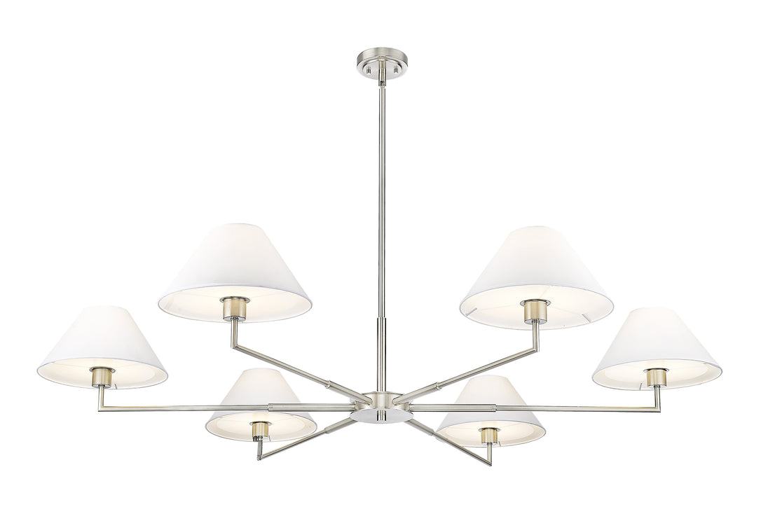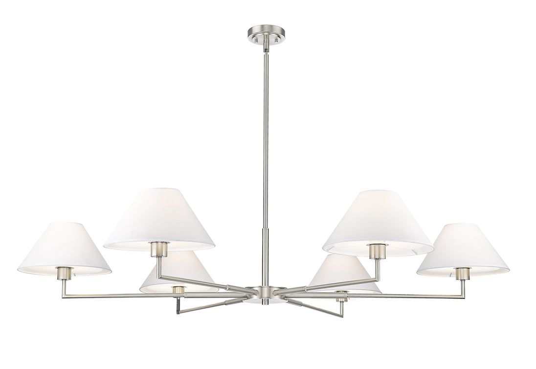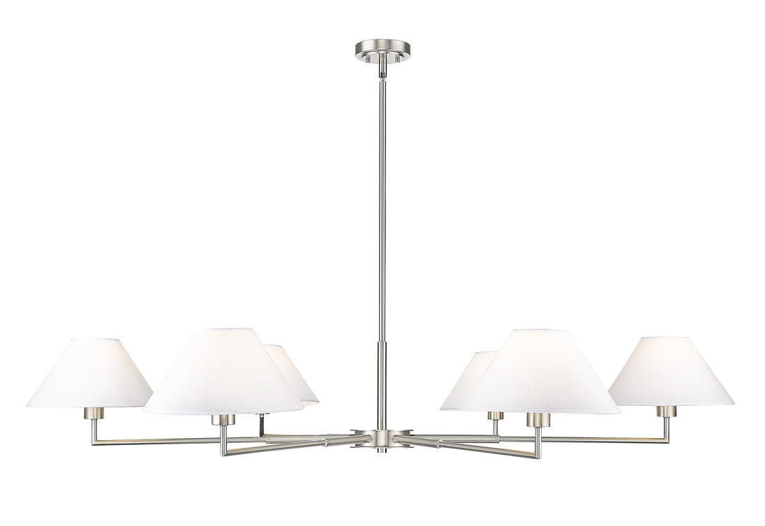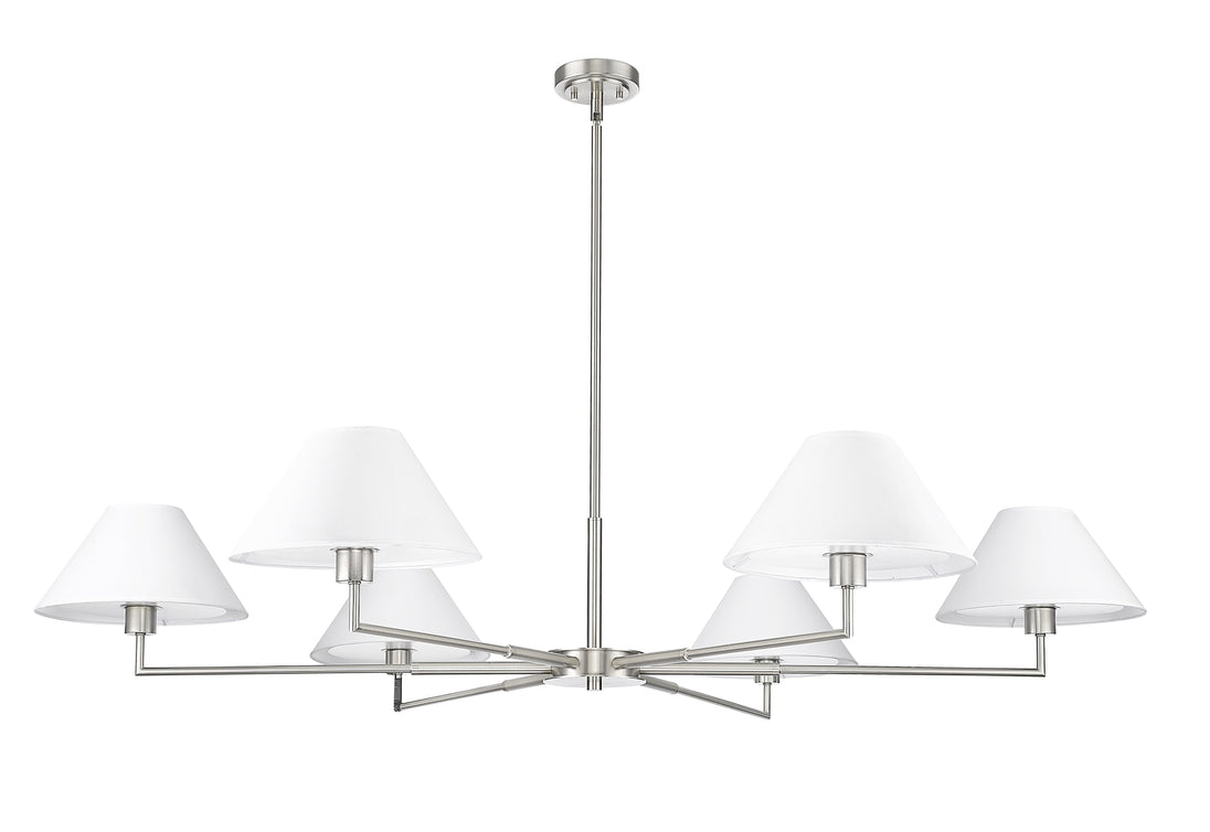 Surrounding decor is instantly elevated with the sleek simplicity of a stylishly modern, wide six-light chandelier. In a gleaming brushed nickel finish, this delightful fixture is a flexible option everywhere from your dining room to a master suite, casting warm, bright illumination while instilling radiant elegance. Its six lights are complete with empire shades for a classic touch updated with white linen for light, bright ambiance.
