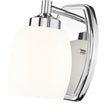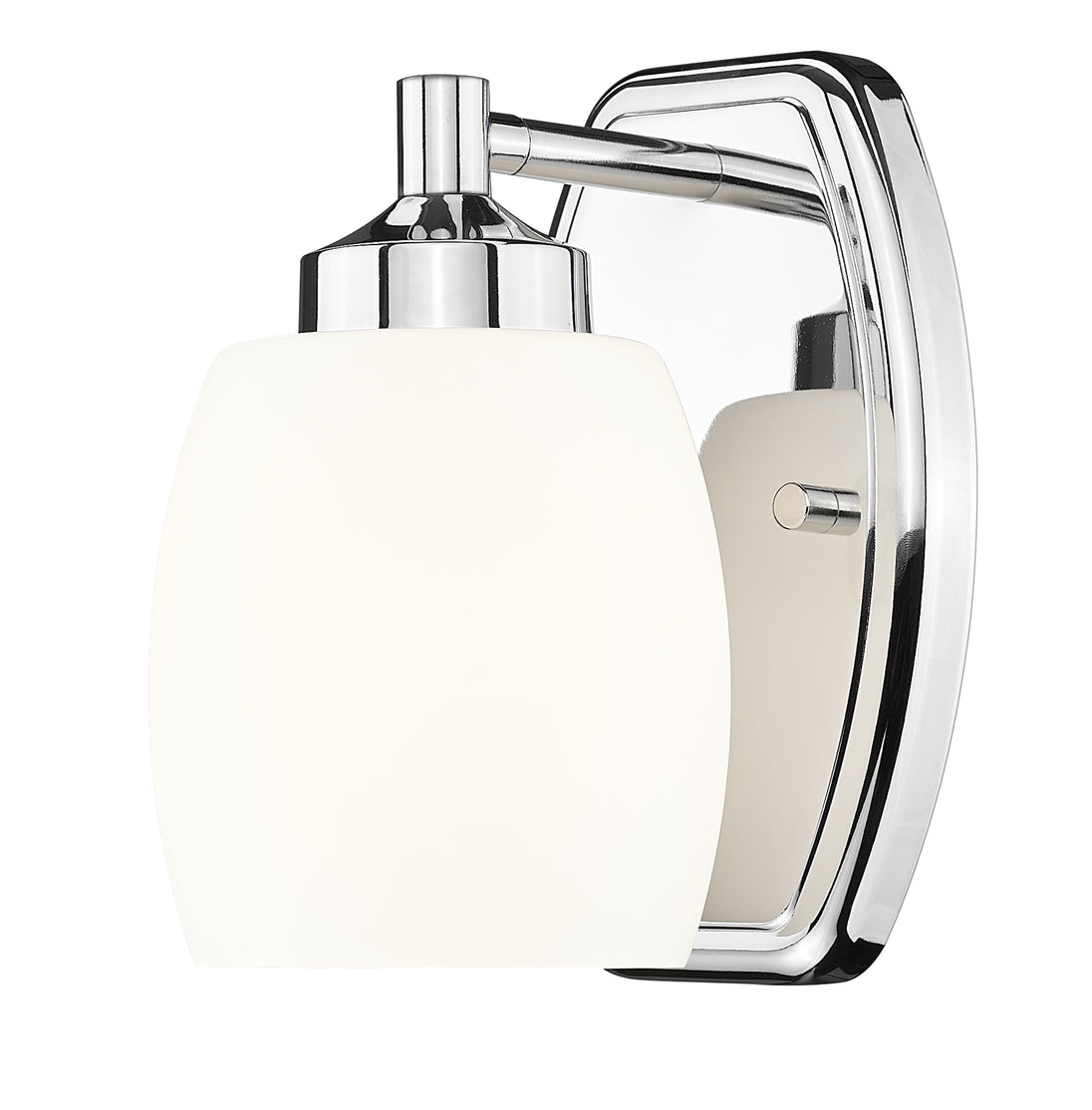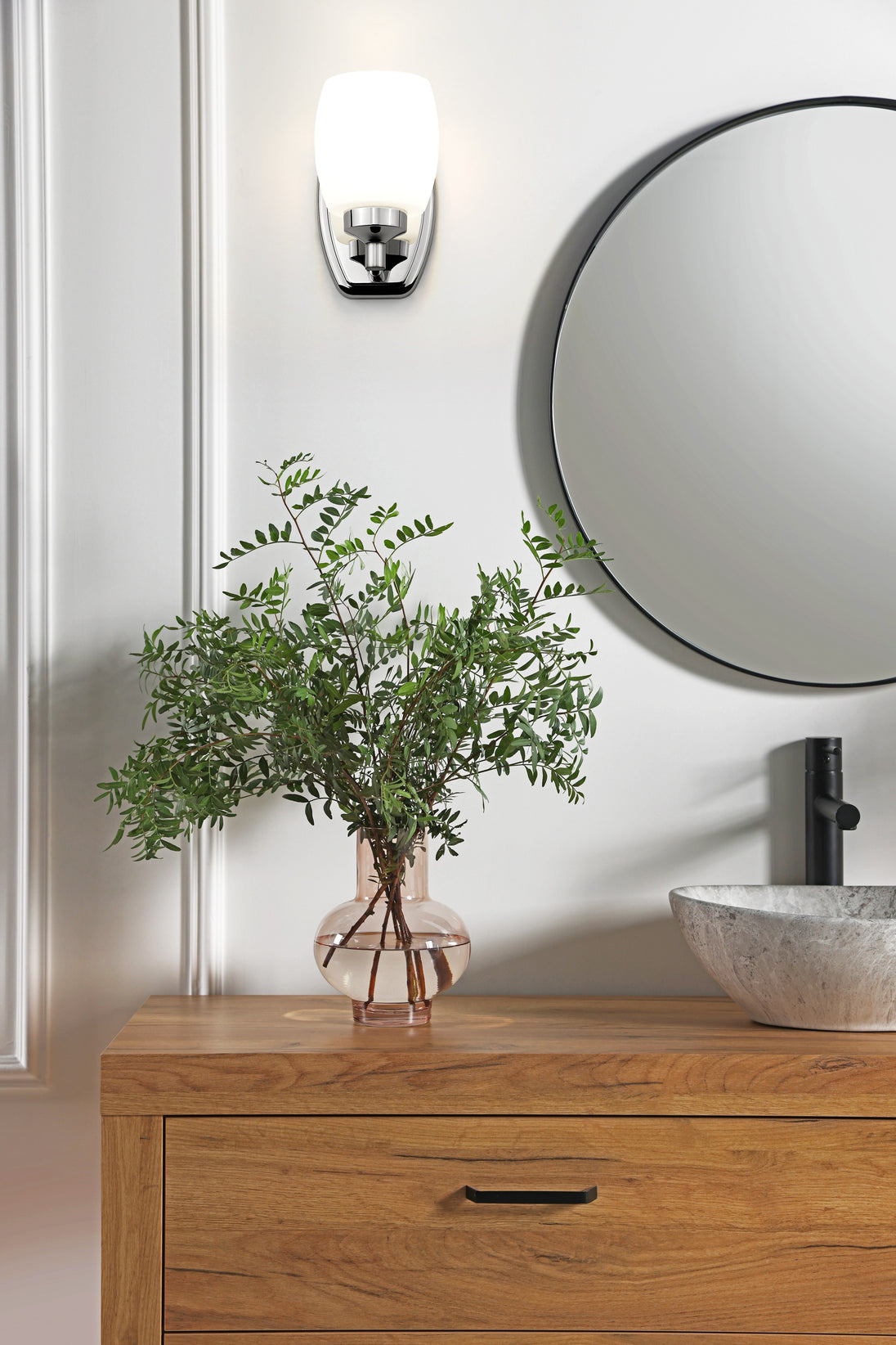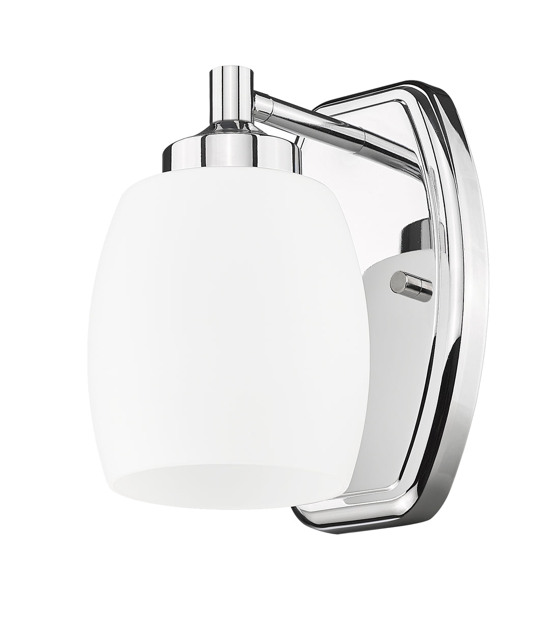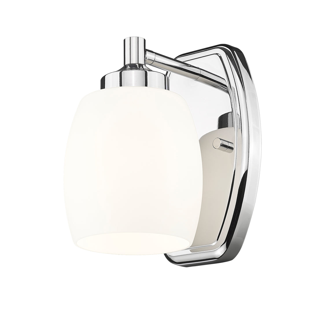 The soothing simplicity of matte opal glass contrasts beautifully with the gleaming chrome finish of a modern one-light wall sconce. Beautiful in a bath or living area, it showcases simple, smooth curves in both its wall plate and shade.