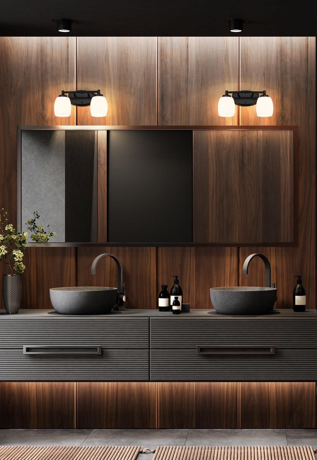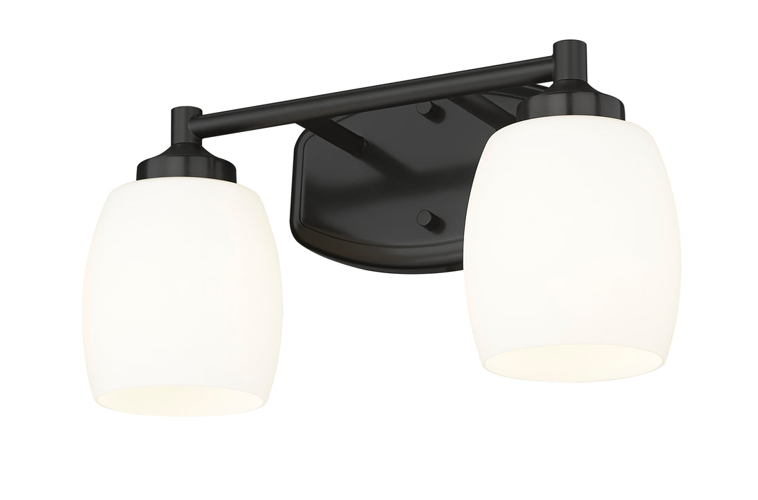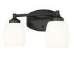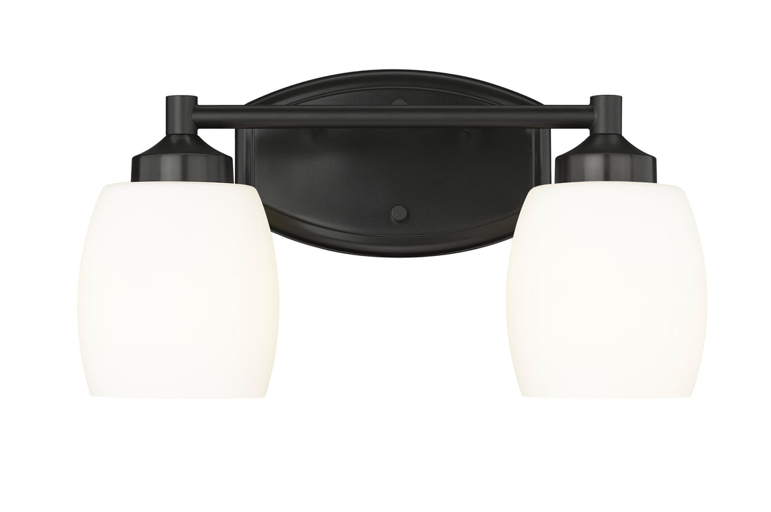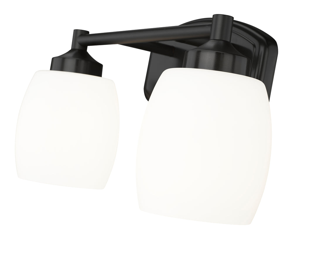 Chic curves highlight the contemporary ambiance of this modern two-light vanity fixture. In matte black over steel construction, the fixture pairs a straight arm with a rounded wall plate and shades, offering an inviting style over your counter. Matte opal glass diffuses illumination beautifully, delivering bright but never harsh lighting for all your morning and evening rituals.