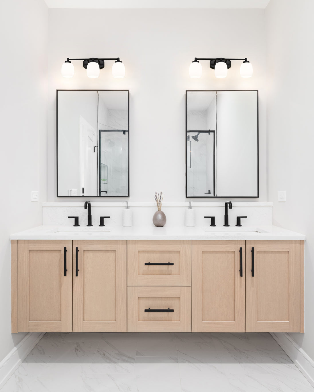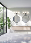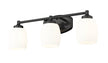 Understated design and subtle curves are the hallmarks of a modern three-light vanity fixture. In matte black for optimal contrast and definition, the fixture features steel construction paired with matte opal shades that diffuse illumination beautifully. It's the ideal solution for a refined, contemporary bathroom space.