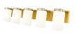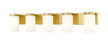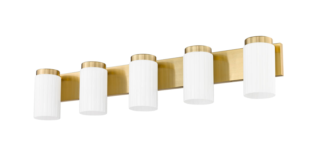 Instill sleek sophistication with the blend of clean-lined design and a rich luxe gold finish featured in this modern five-light vanity fixture. Its wonderful warmth is complemented with beautiful illumination, which filters through opal glass cylinders to create an inviting ambiance for relaxation and grooming tasks.