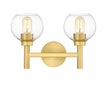 A contemporary two-light vanity sconce boasts graceful curves that create its perfect circle design elements. Its familiar, torch-inspired silhouette is adorned with a brushed gold finish for warm, glamorous flair in an entry or bathroom. A pair of open-edged, clear glass globe shades adds precision, and this fixture can be mounted with lights either up or down to best suit your space and preference.