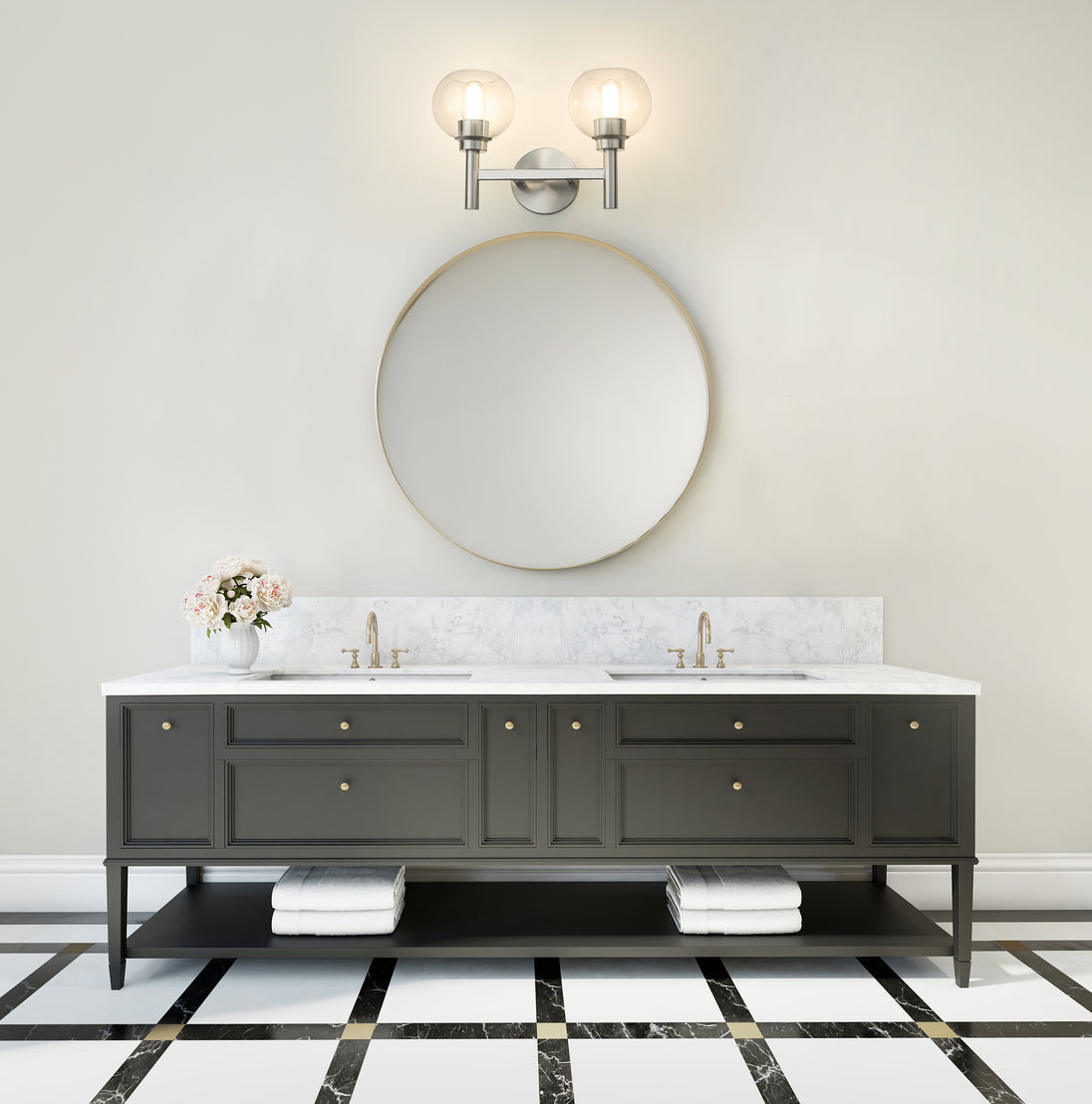Is there anything more perfect in design than a circle? The Sutton bath series embraces the familiar shape in its backplate and echoed by the open-edge globe shades that can be mounted up or down. Available in 1- to 5-light versions in a choice of Matte Black, Brushed Nickel, Chrome, and Olde Brass finishes.