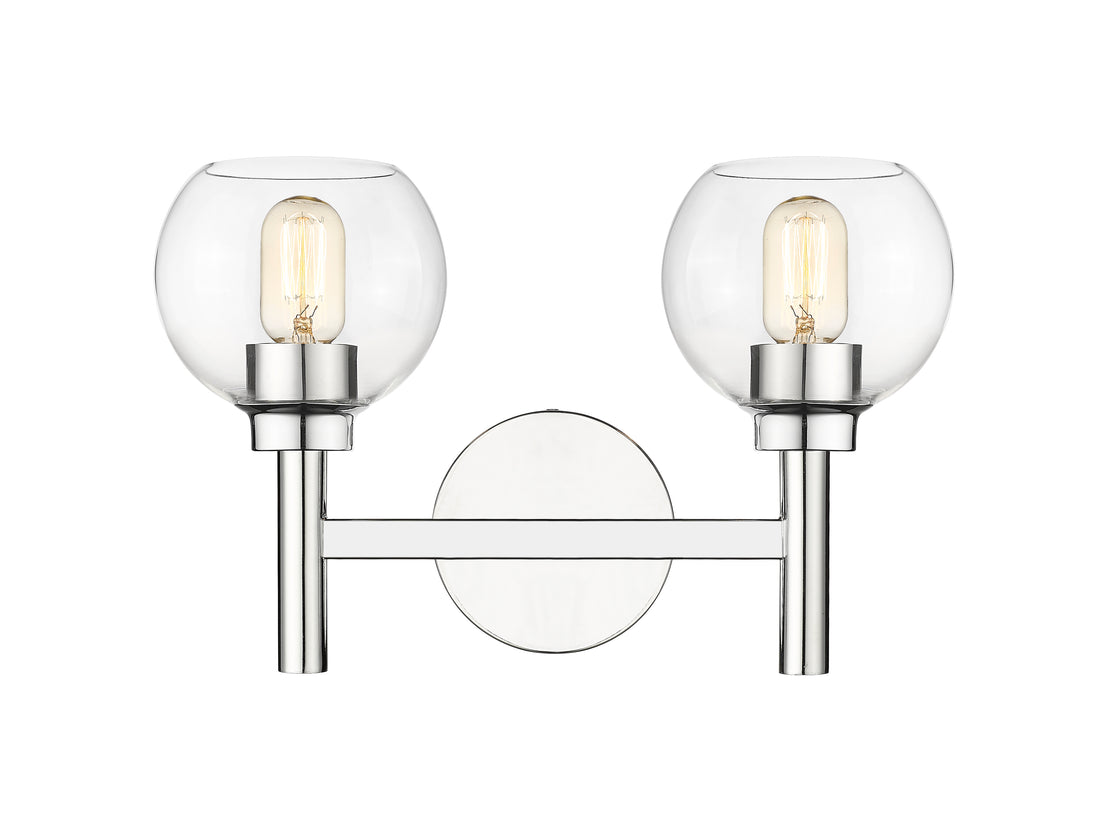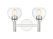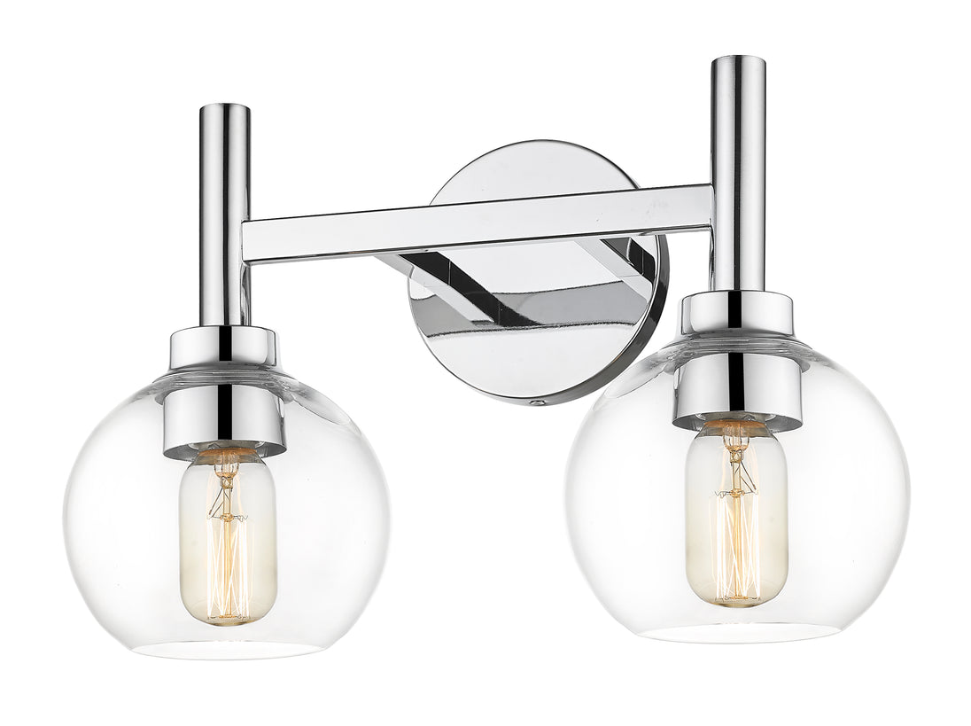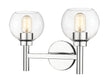 A contemporary two-light vanity sconce boasts graceful curves that create its perfect circle design elements. Its familiar, torch-inspired silhouette is adorned with a chrome finish for polished flair in an entry or bathroom. A pair of open-edged, clear glass globe shades adds precision, and this fixture can be mounted with lights either up or down to best suit your space and preference.
