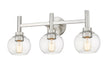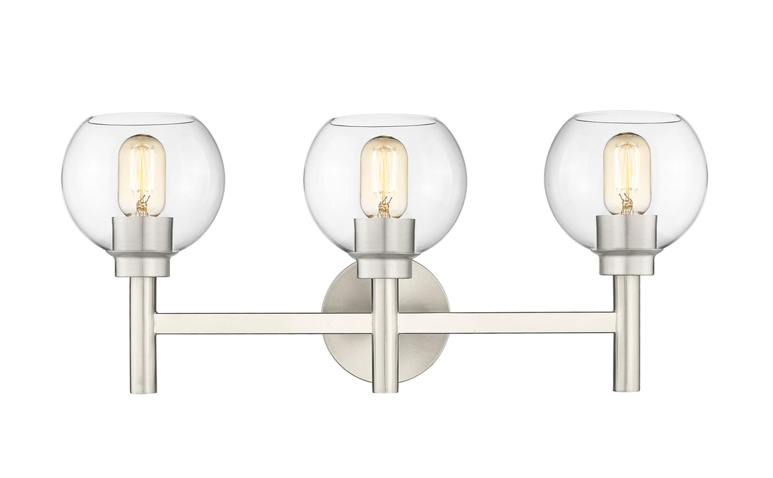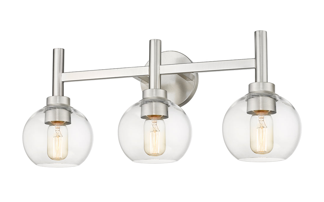 The precision of a perfect circle defines the modern ambiance of a contemporary three-light vanity wall light. From the Sutton collection, the sconce boasts a trio of torch-style lights, complete with brushed nickel finish framing and a round wall plate. Three open-edged globe shades are precisely crafted in clear glass, delivering maximum illumination to your vanity and bathroom space.