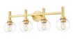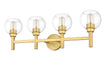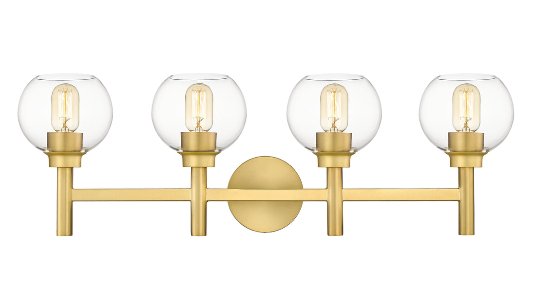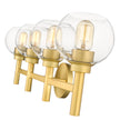 A precise, perfect circle creates the inspirations for the modern ambiance of third contemporary four-light vanity wall light. Designed for the Sutton collection, the sconce showcases four of torch-style lights paired with steel framing and a round wall plate, all in a warm brushed gold finish. A quartet of open-edged globe shades are expertly crafted in thick, clear glass, delivering maximum illumination to your vanity and bathroom space.