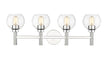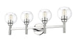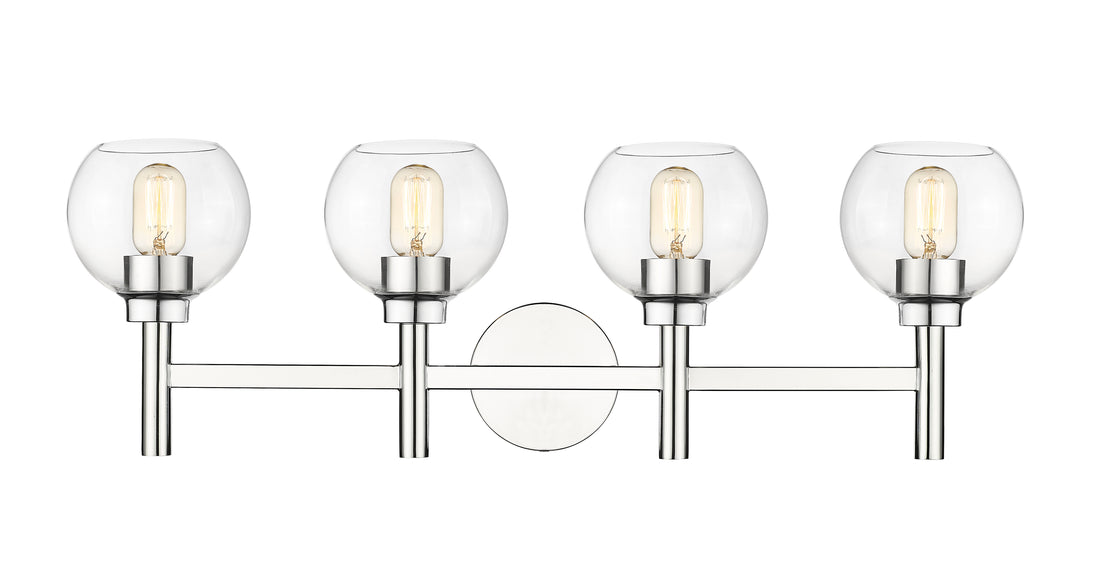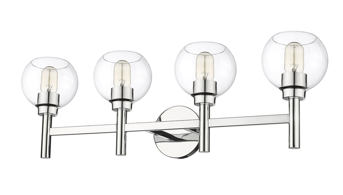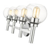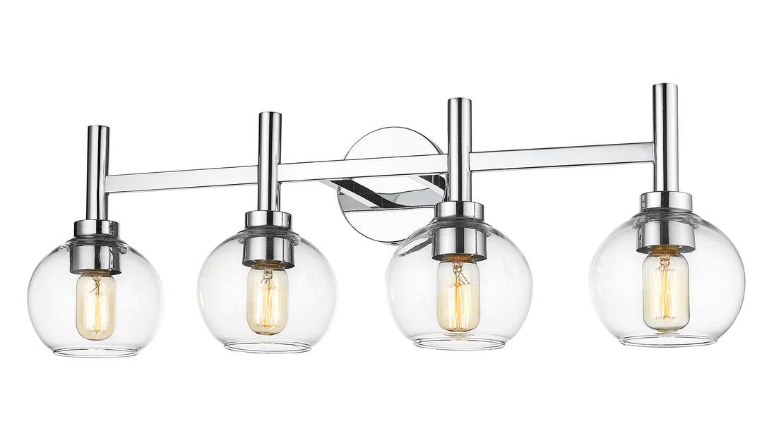 A precise, perfect circle creates the inspirations for the modern ambiance of third contemporary four-light vanity wall light. Designed for the Sutton collection, the sconce showcases four of torch-style lights paired with steel framing and a round wall plate, all in a gleaming chrome finish. A quartet of open-edged globe shades are expertly crafted in thick, clear glass, delivering maximum illumination to your vanity and bathroom space.