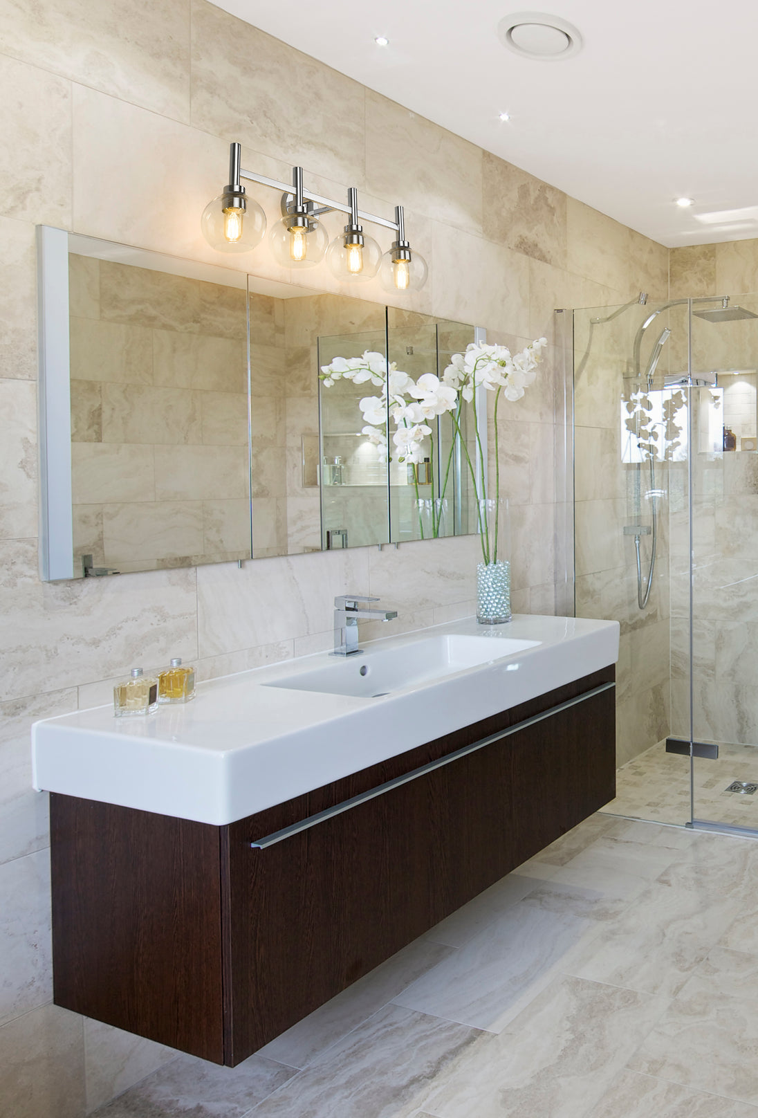 Is there anything more perfect in design than a circle? The Sutton bath series embraces the familiar shape in its backplate and echoed by the open-edge globe shades that can be mounted up or down. Available in 1- to 5-light versions in a choice of Matte Black, Brushed Nickel, Chrome, and Olde Brass finishes.