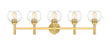 Span a graceful double vanity space with the exacting precision of a modern five-light vanity wall light. Designed inspirations come from the perfect form of a circle, comprised of open-edged globe shades in clear glass. Torch-style framework and a round wall plate are crafted in steel and receive a warm olde brass finish for timeless elegance.