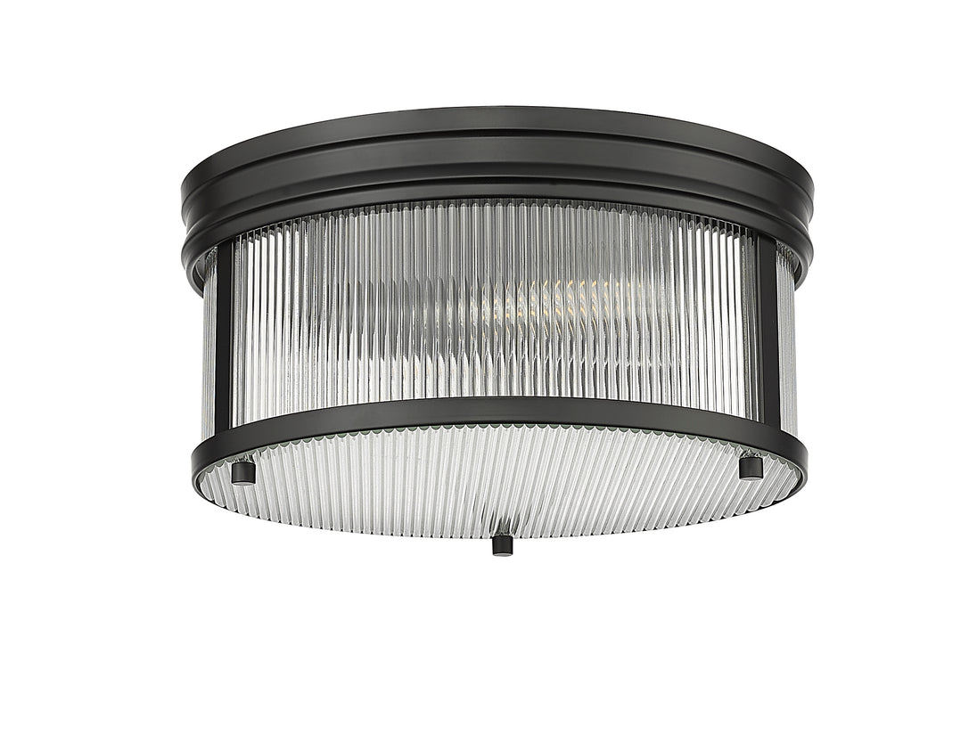 Chic ribbed glass brings an elevates sensibility to the transitional framework of a modern two-light flush mount ceiling light. Its matte black finish provides striking definition and casual elegance, perfect for an entryway, living area, or bedroom.