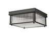 A timeless silhouette is transformed with the choice of architectural ribbed glass that decorates this modern two-light flush mount ceiling light. Striking in spots with lower ceiling clearance, it's a distinctive design that finds definition in its cool matte black finish and squared silhouette. It's a gorgeous choice for a bedroom, den, or even in your entryway.