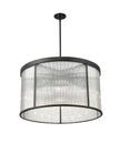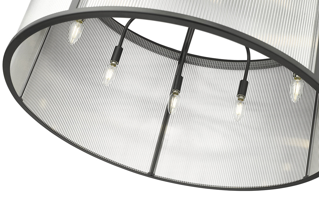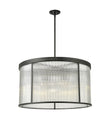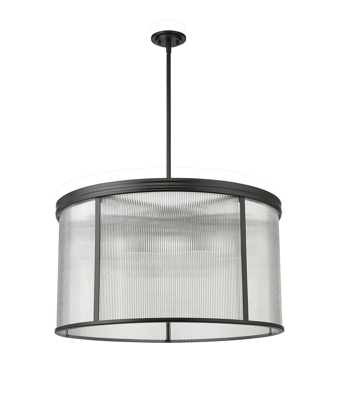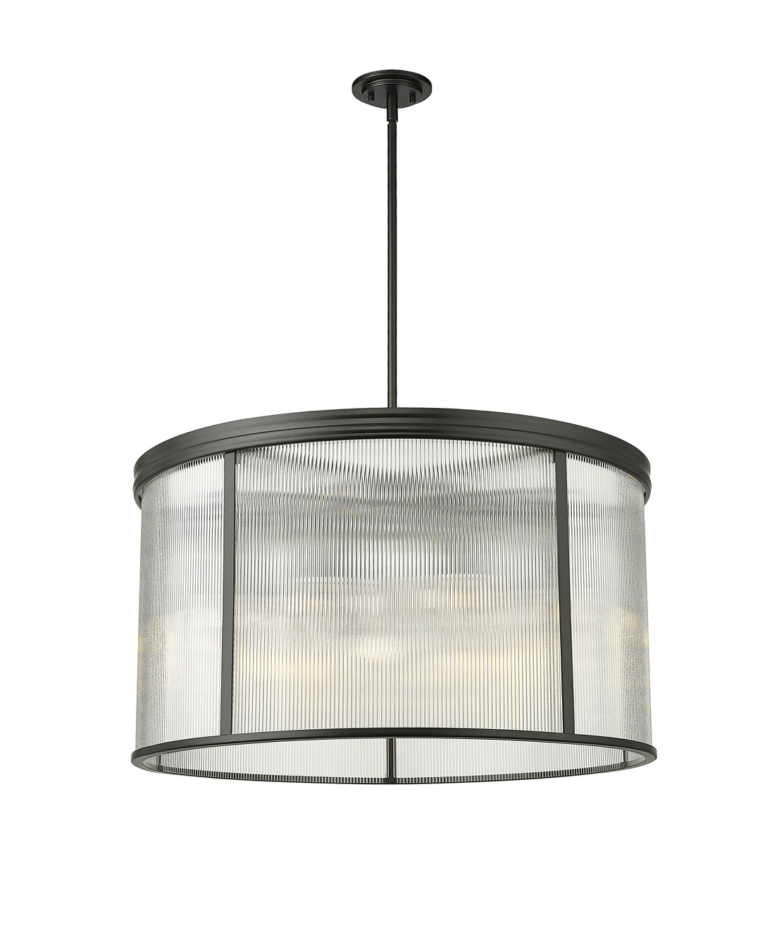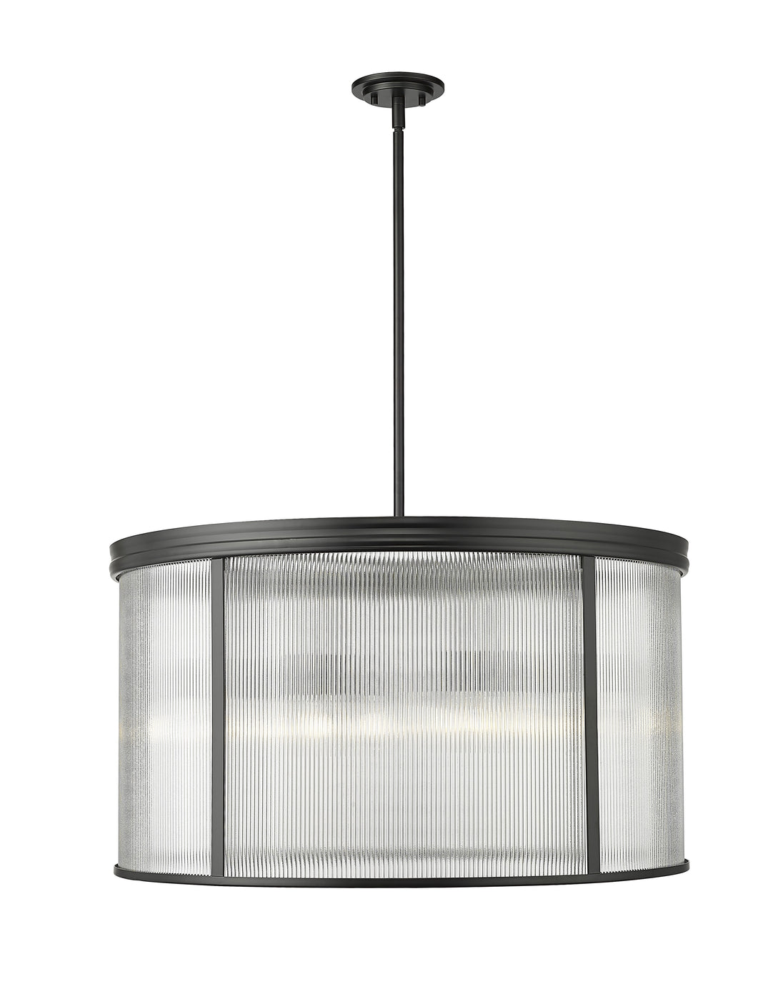 Modern energy infuses the timeless profile and deep matte black of a chic nine-light chandelier. Gorgeous centered over a dining table or living room sitting area, the chandelier pairs the soothing elegance of a drum silhouette with the character and textural dimension of architectural ribbed glass, creating a sum greater than its parts. it's the perfect upgrade over a welcoming dining table or beautiful foyer.