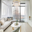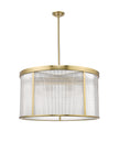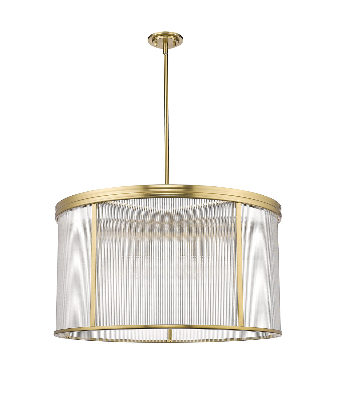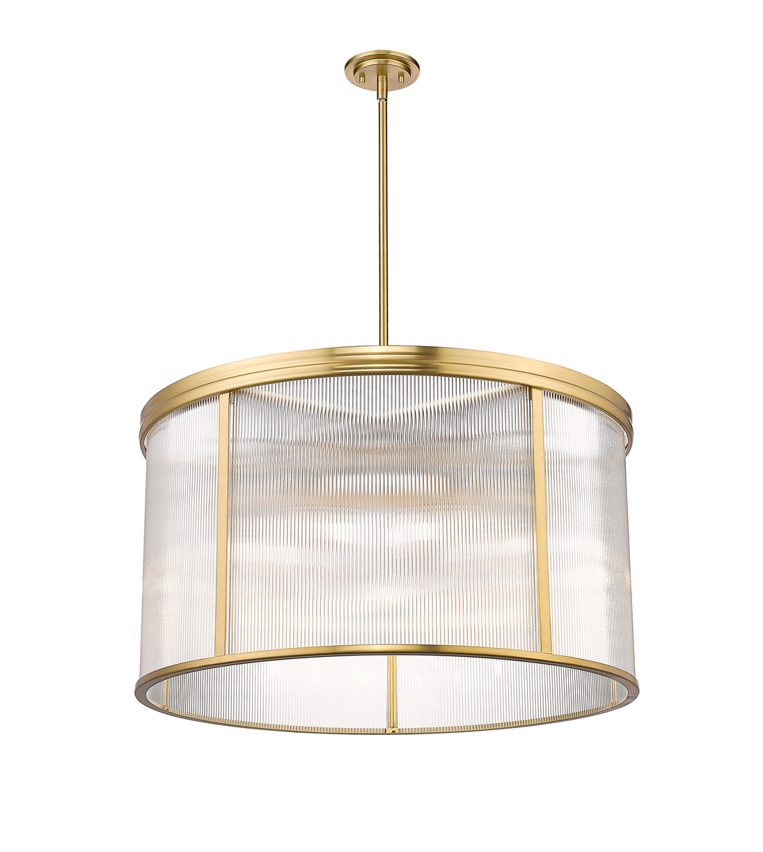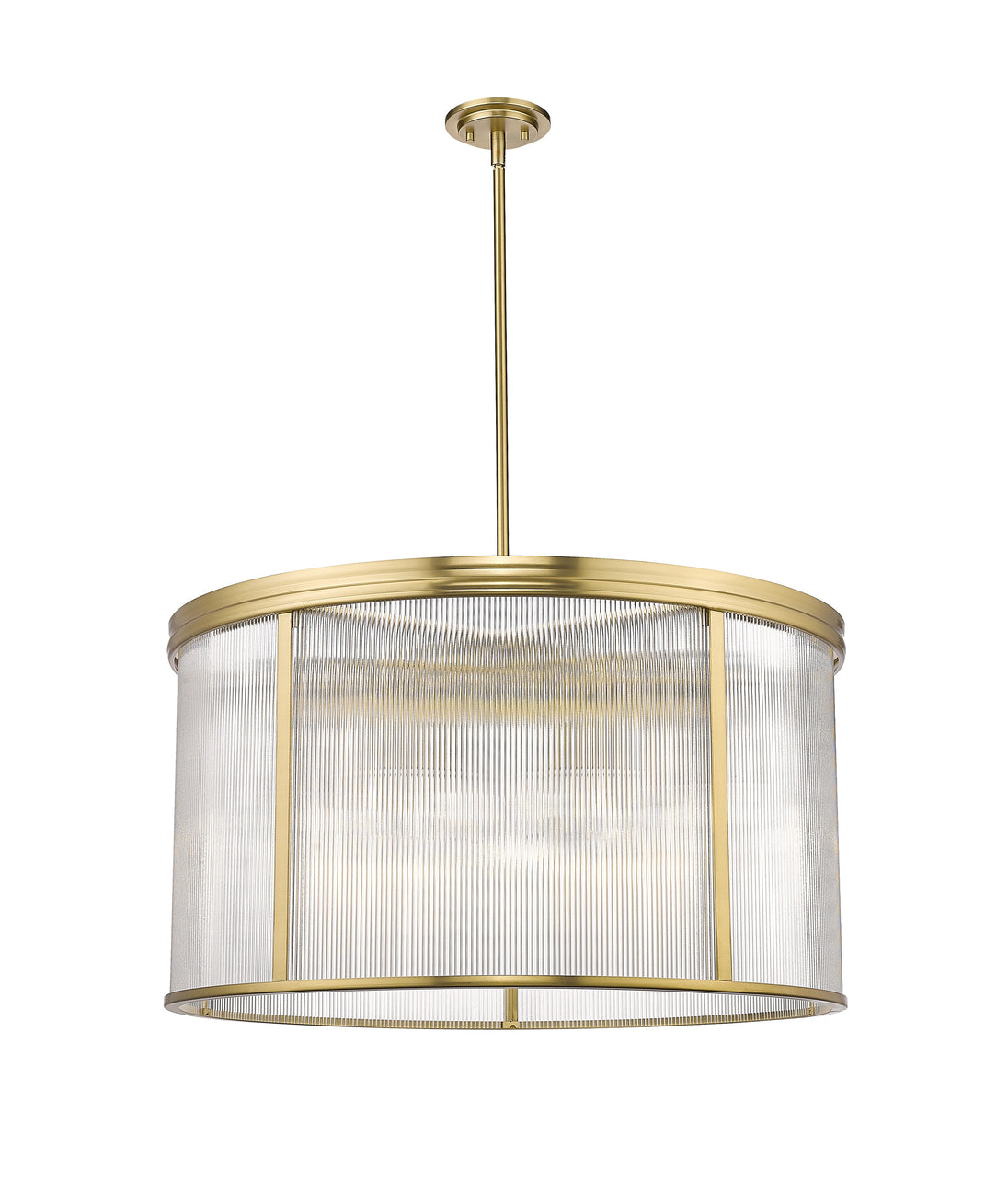 Modern energy infuses the timeless profile and warm modern gold finish of a chic nine-light chandelier. Gorgeous centered over a dining table or living room sitting area, the chandelier pairs the soothing elegance of a drum silhouette with the character and textural dimension of architectural ribbed glass, creating a sum greater than its parts. It's the perfect upgrade over a welcoming dining table or beautiful foyer.