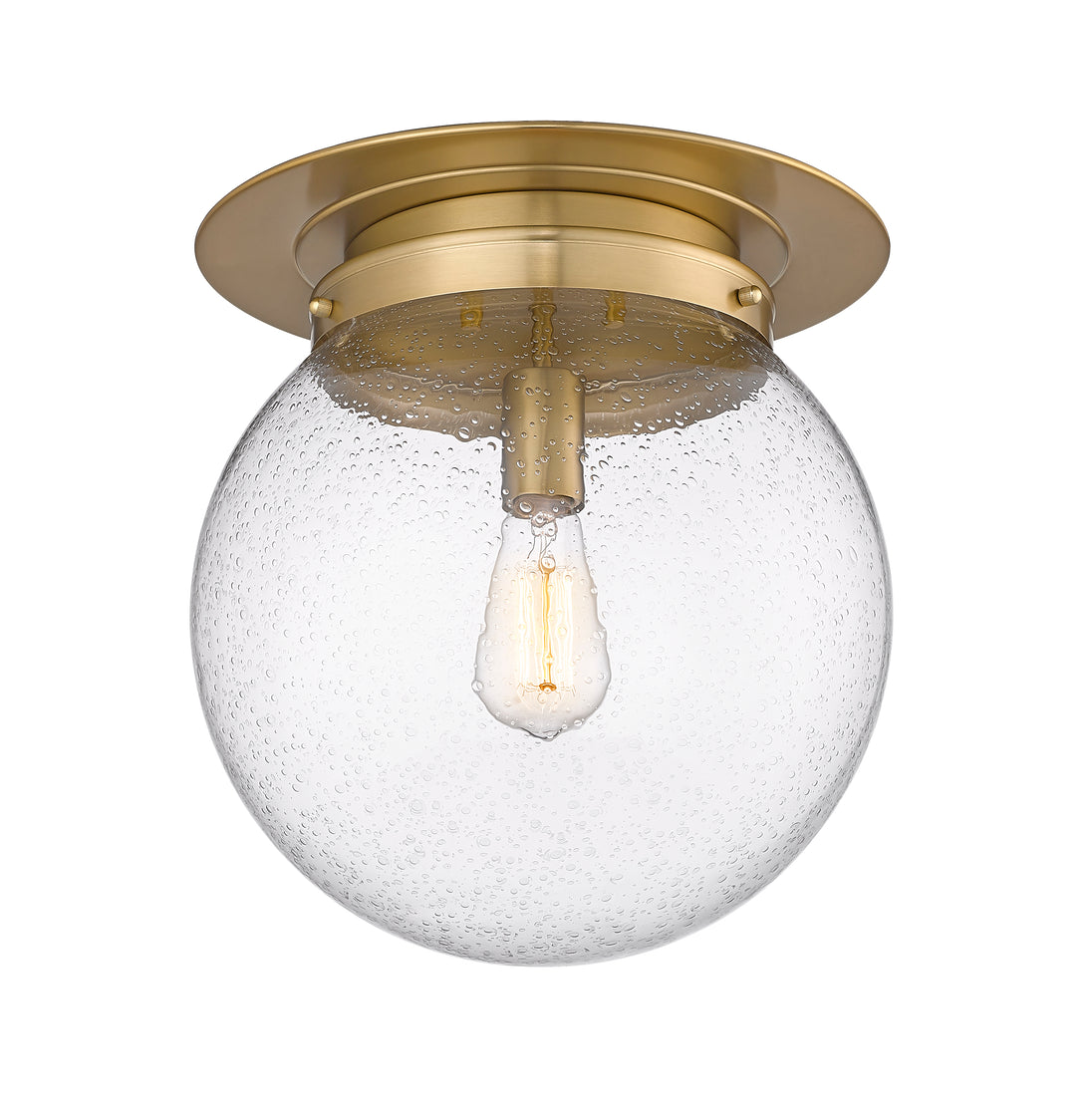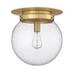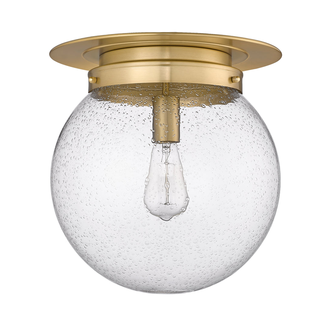 Appreciate the easy feel of a light fixture that works wonders in both contemporary and transitional settings. This one-light flush mount from the Calhoun collection delivers a shapely, symmetrical silhouette with a frame and accents featuring heritage brass finish metal. A delightful clear seedy glass globe shade adds a dose of elegance suitable for any space.
