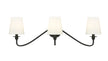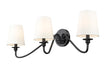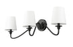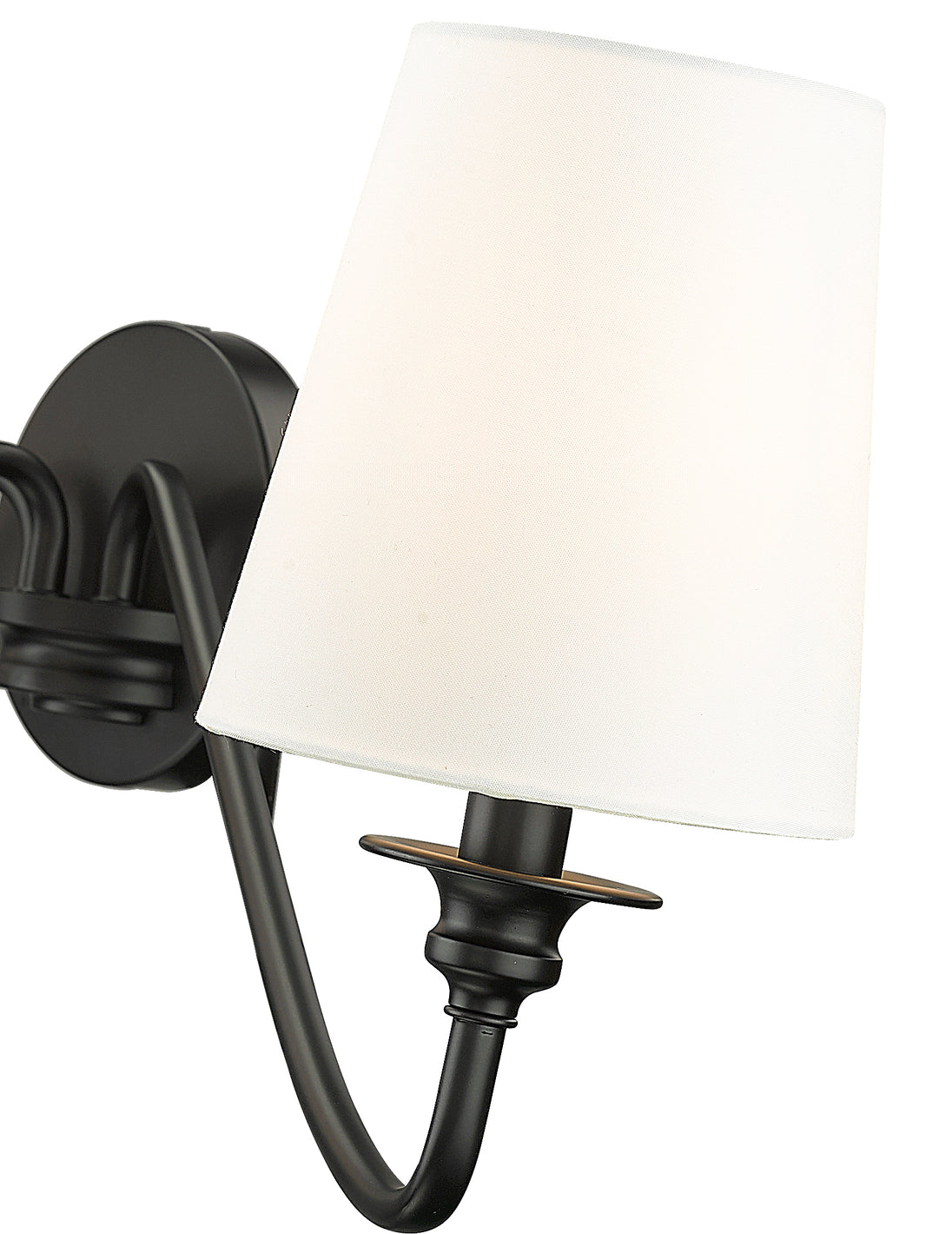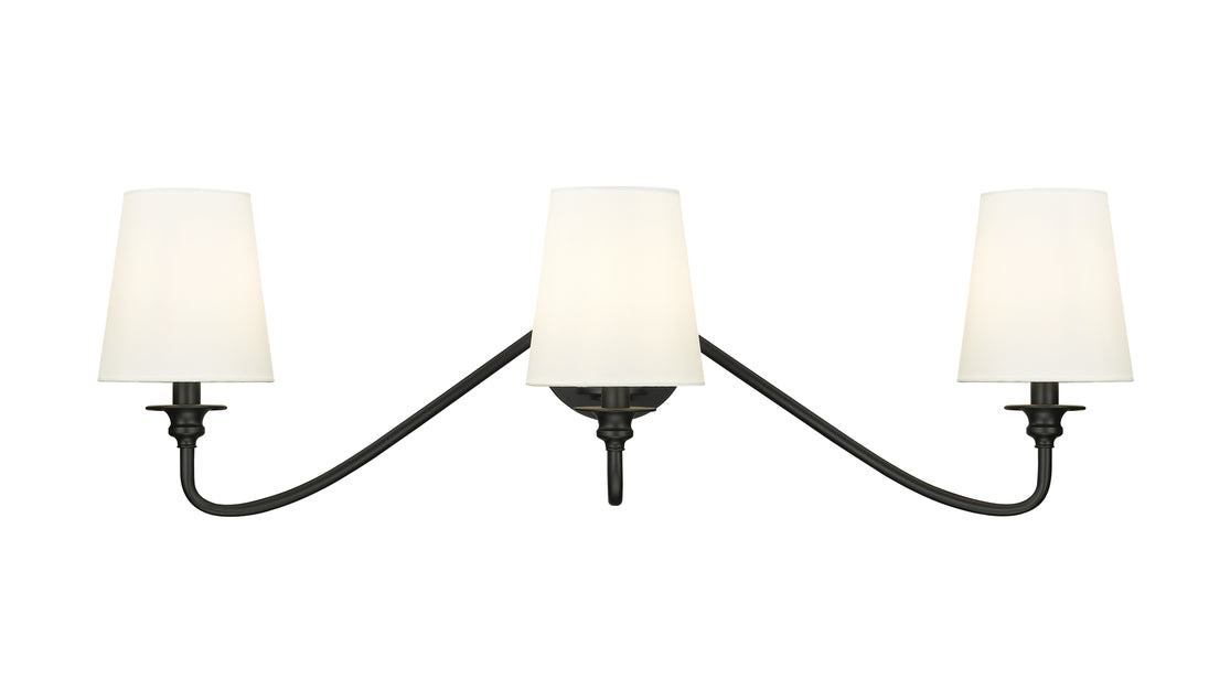 Create a rich, welcoming ambiance in a family room or foyer with a modern three-light wall sconce. Designed for impeccable, refined style, it features a trio of curvy arms emerging from a compact round wall plate, all in a crisp matte black finish that creates a sense of distinction. Three opaque white shades add a modern empire silhouette, perfect for a variety of spaces.