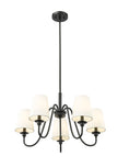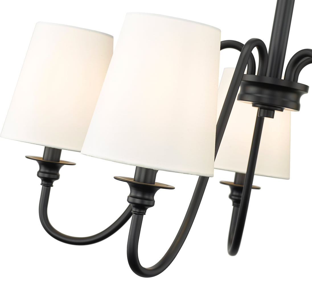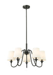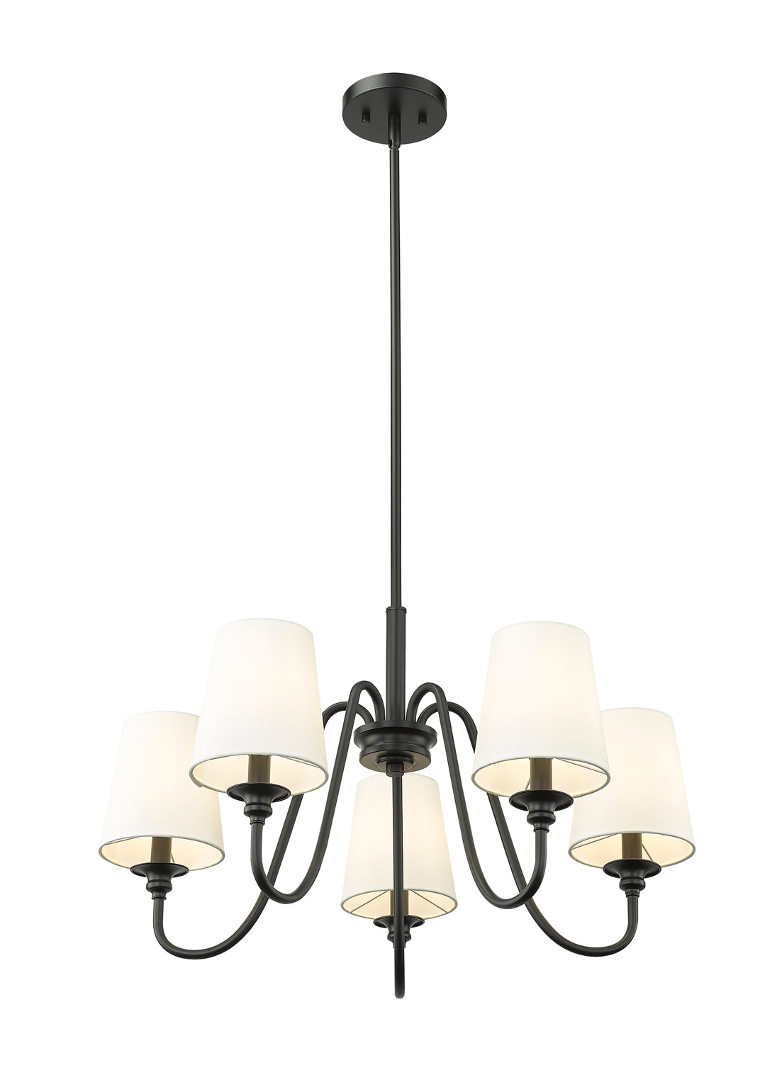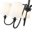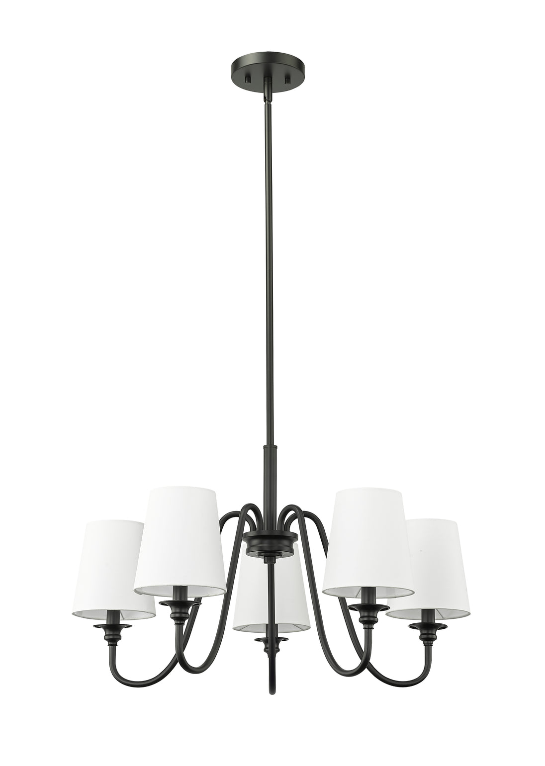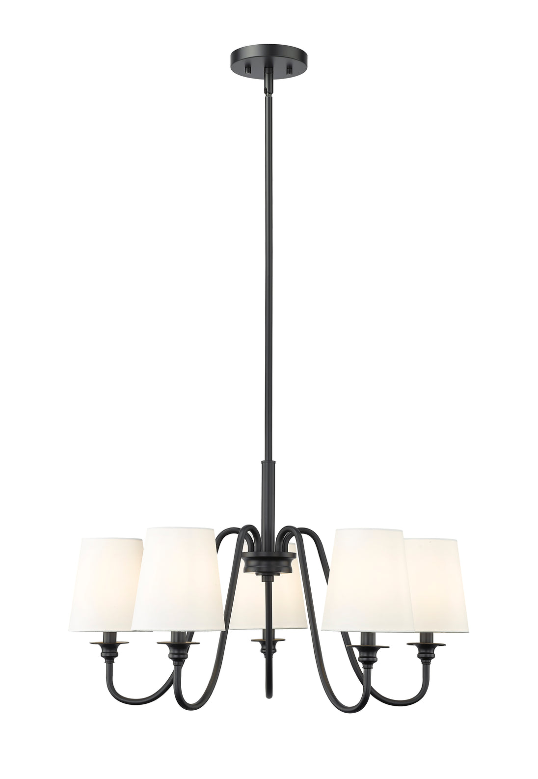 Swooping arms define the minimalist simplicity of a modern five-light chandelier. Its classic elegance is enhanced with classic candlestick styling paired with a rich matte black finish. Five shades are opaque white, offering diffused illumination and elegant ambiance over a dining table or living room sitting area.