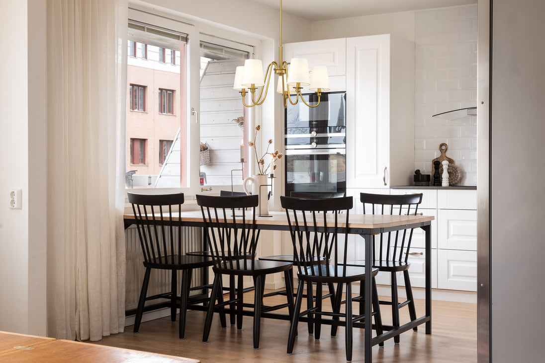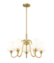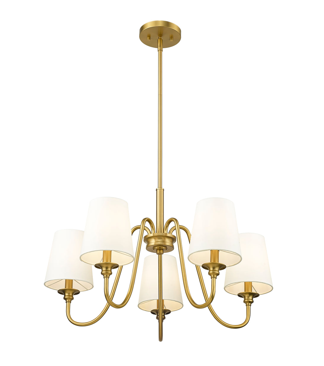 Swooping arms define the minimalist simplicity of a modern five-light chandelier. Its classic elegance is enhanced with classic candlestick styling paired with a rich modern gold finish. Five shades are opaque white, offering diffused illumination and elegant ambiance over a dining table or living room sitting area.