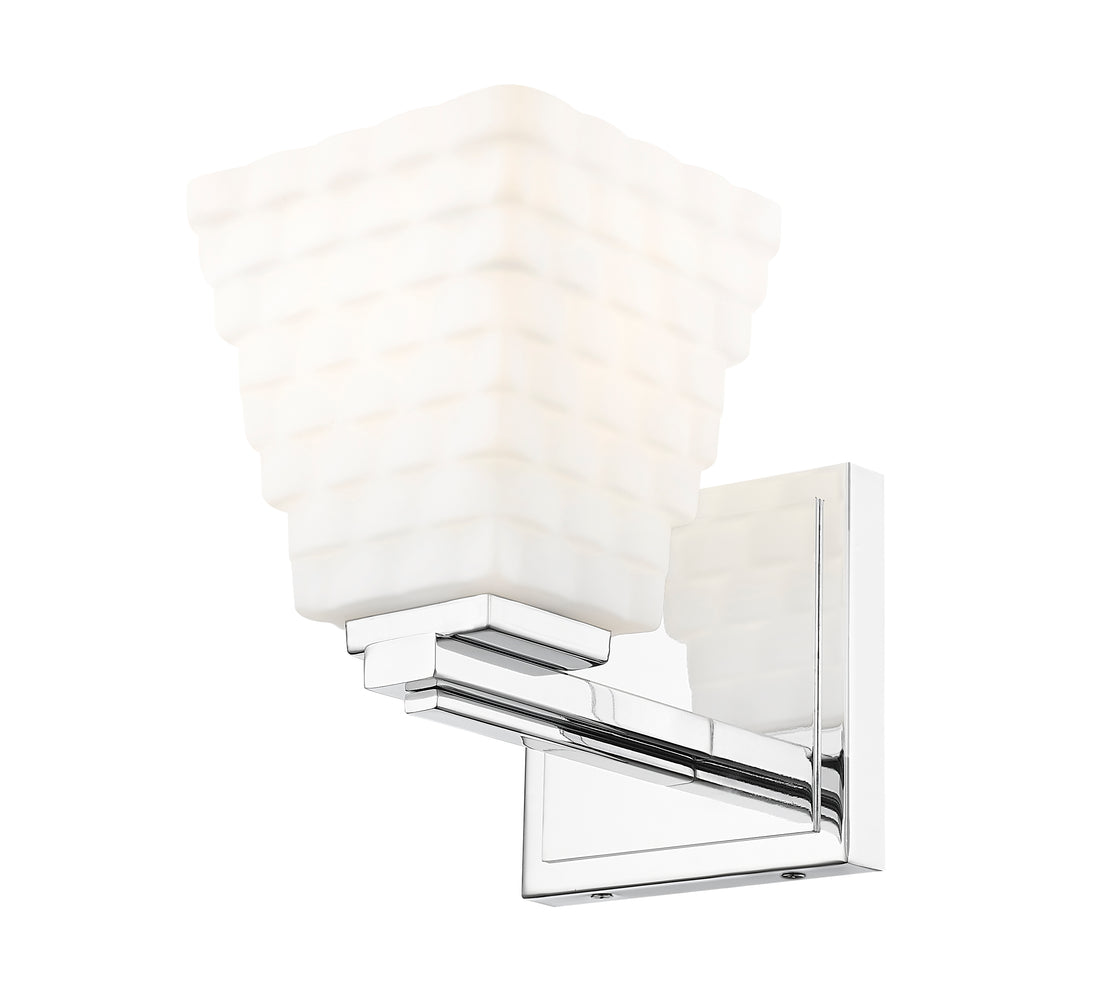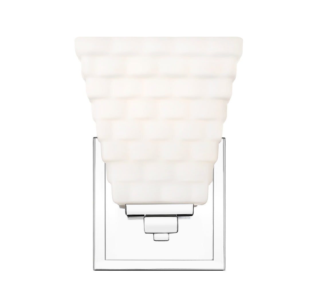 Gleaming chrome adds reflectivity to the stacked opal glass shade featured on this modern one-light wall sconce. It's a clean-lined presentation, creating a fresh look and feel that brims with texture. Its layered details enhance perfectly beside a bathroom vanity or in a dressing room.