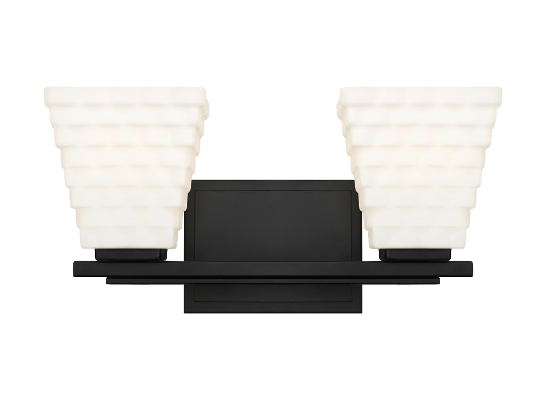 Create bold contrast with the dynamic matte black frame finish featured on this modern two-light vanity bath light. Impeccably designed, its backplate and arm offer understated layered details, perfectly complementing its shades. Each shade is fashioned in layered rectangular of opal glass, creating contrast and delivering bright illumination.