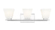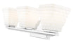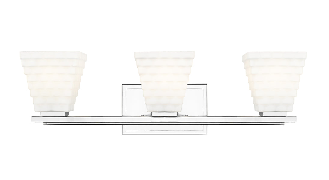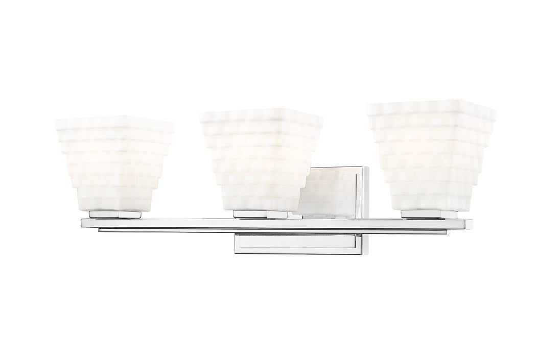 Cast bright ambient illumination through your space with this modern three-light vanity bath light. Matte opal glass is delicately layered to create a tapering square silhouette for each of three shades as they diffuse illumination. A layered arm and backplate receive a gleaming chrome finish, offering a fresh look and feel in your en suite or guest bathroom.