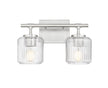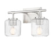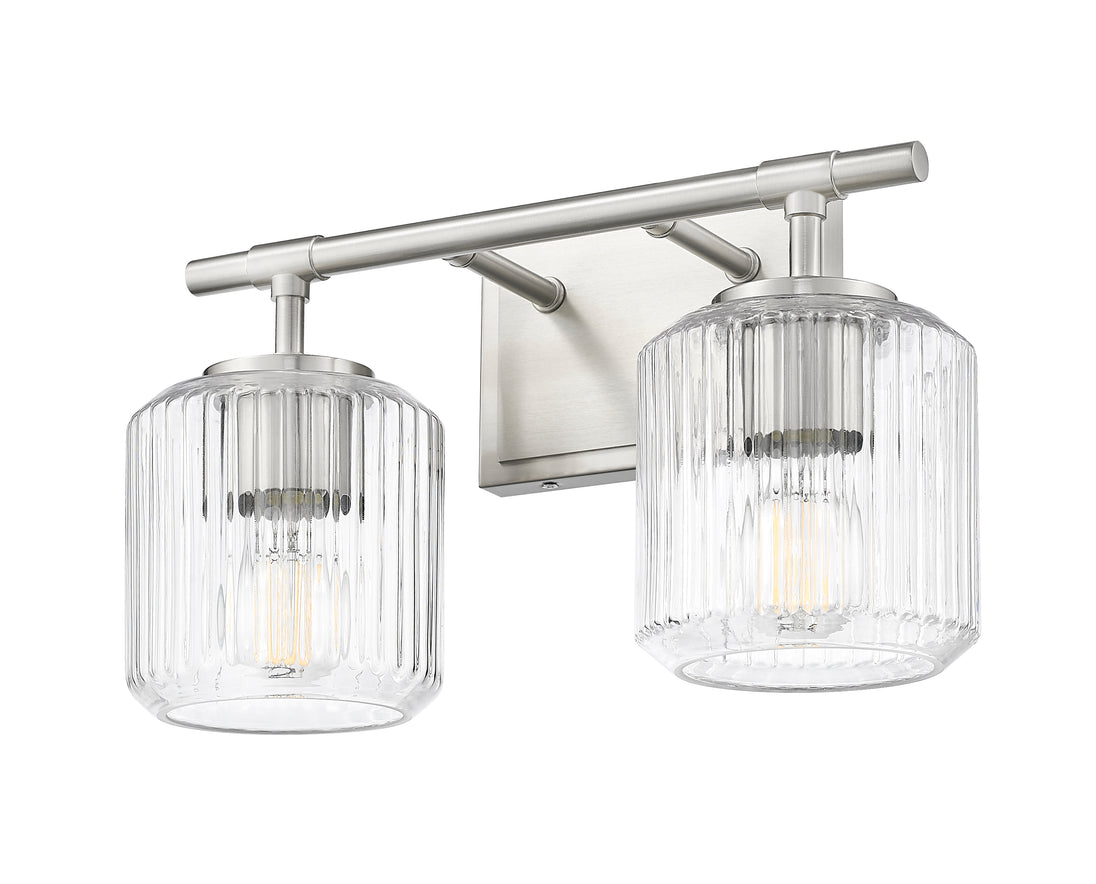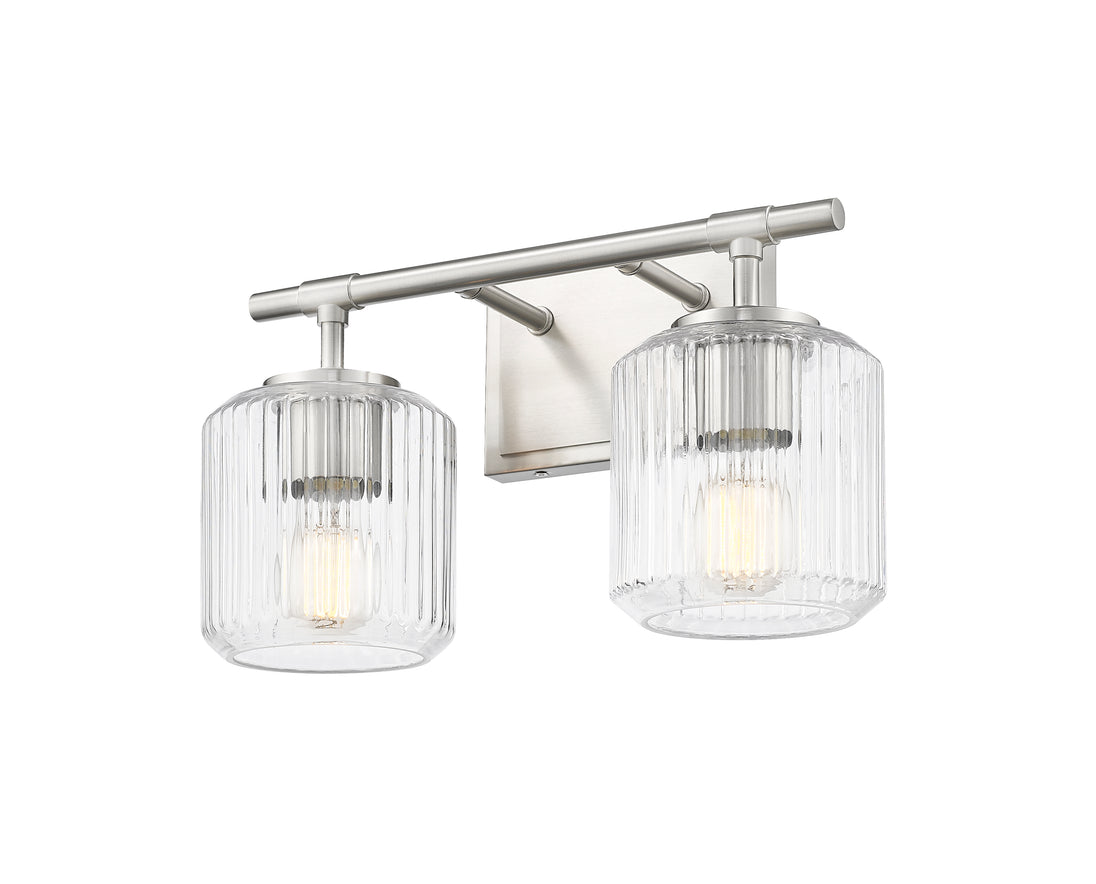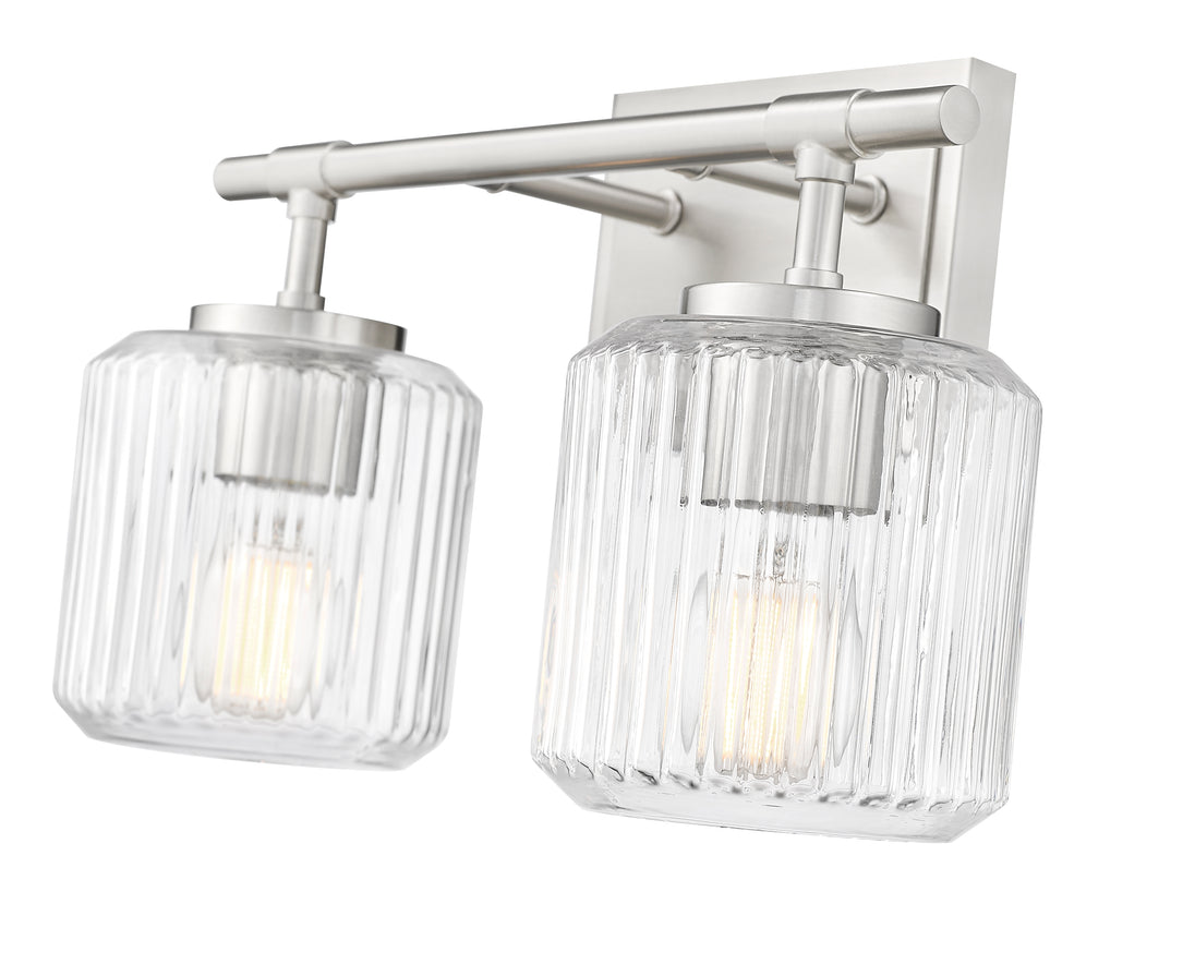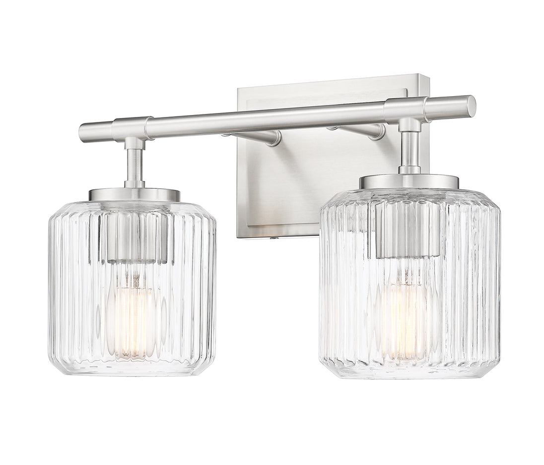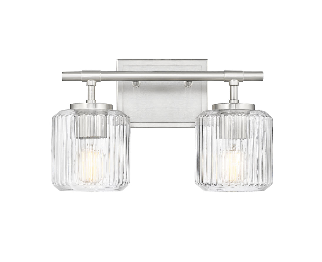 Sparkling ribbed glass creates a soft, undulating effect for this modern two-light vanity bath light. Beautiful in contemporary, transitional, and traditional settings, it showcases a simple wall plate and straight arms, all in a soft brushed nickel finish that's sure to complement in any setting.
