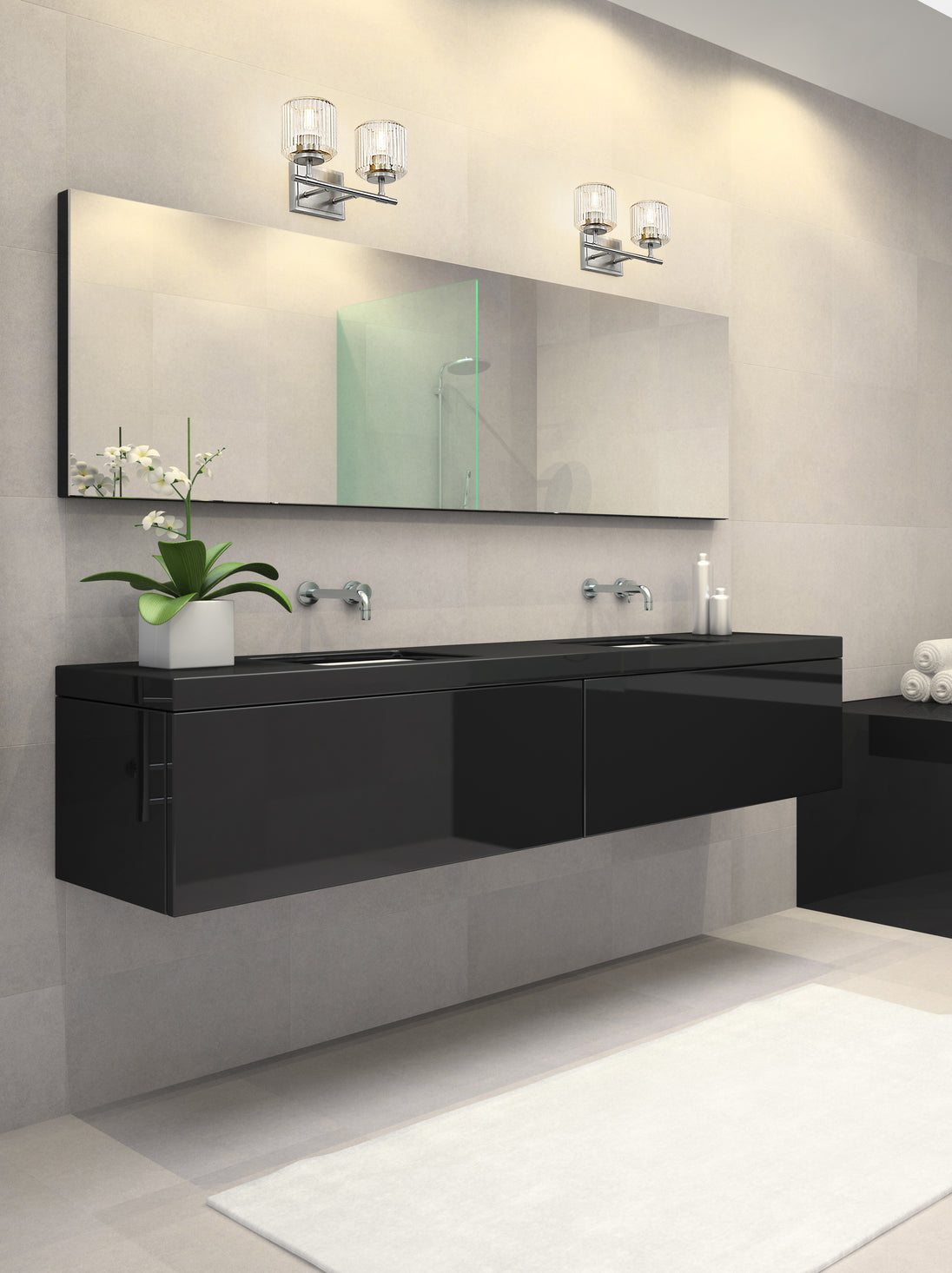 The undulating edges of the sparkling clear glass on the Landon collection provide an unexpected modern touch to the classic ribbed glass shade style. The clean lines make Landon appropriate for modern, transitional, and contemporary bath settings while the choice of finish options – Matte Black, Brushed Nickel, Chrome, and Modern Gold – personalizes the look.