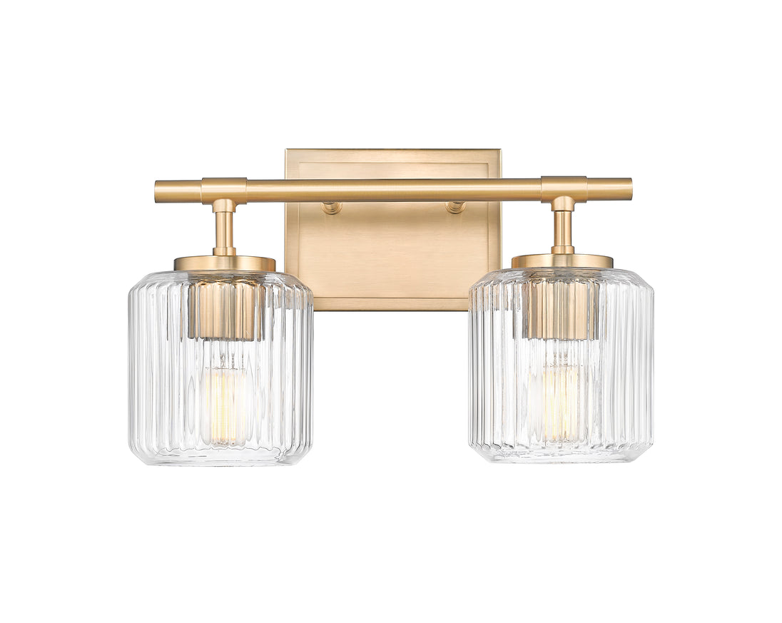 Enjoy the rich warmth of a sophisticated modern gold finish on this contemporary two-light vanity bath light. Sparkling ribbed glass shades complete the look, offering richness and movement while maintaining timeless aesthetics to complement in any setting.