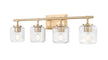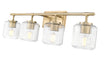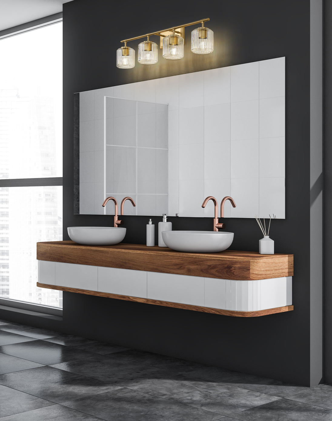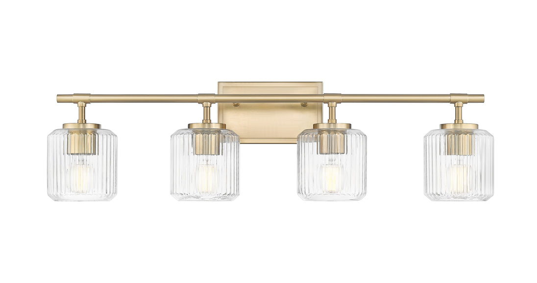 The warmth of a modern gold finish is a perfect complement to the clean-lined design of this contemporary four-light vanity bath light. Its rectangular wall plate and straight arm create a sense of structure, while ribbed glass shades sparkle in the light. Their subtle design offers undulating flair, perfect for elevating your vanity or bath.