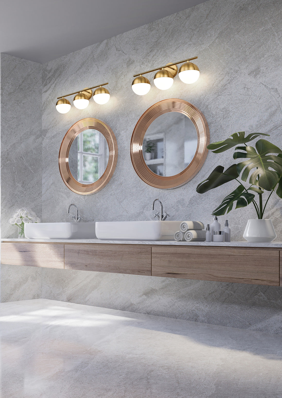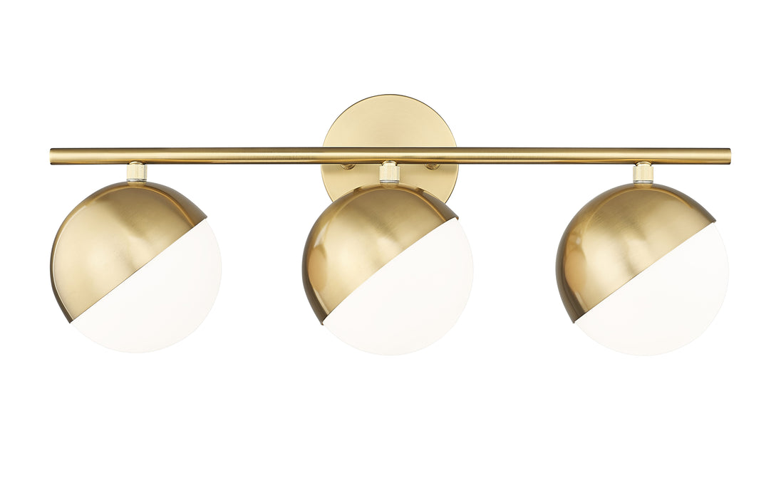 Create the perfect look for your primary or guest bath with a mid-century three-light vanity bath light. It delivers rich warmth with a modern gold finish, and includes three orb shades of matte opal glass for soft, inviting illumination. It's a stunning choice over your vanity, perfect for a sophisticated ambiance.