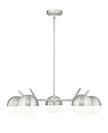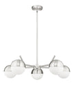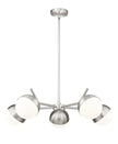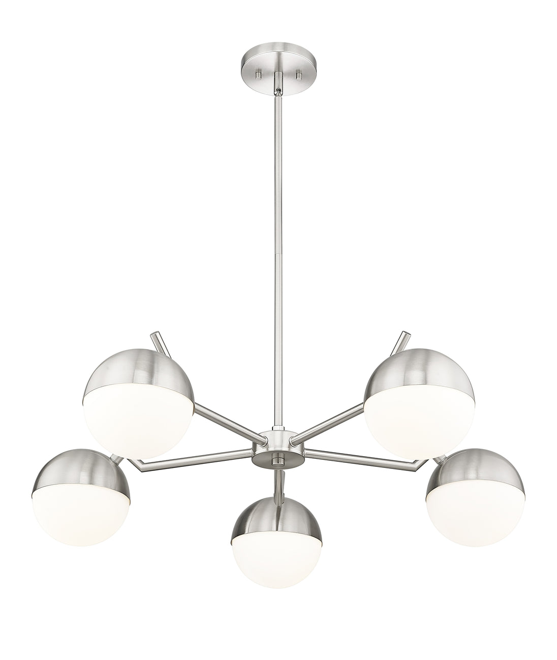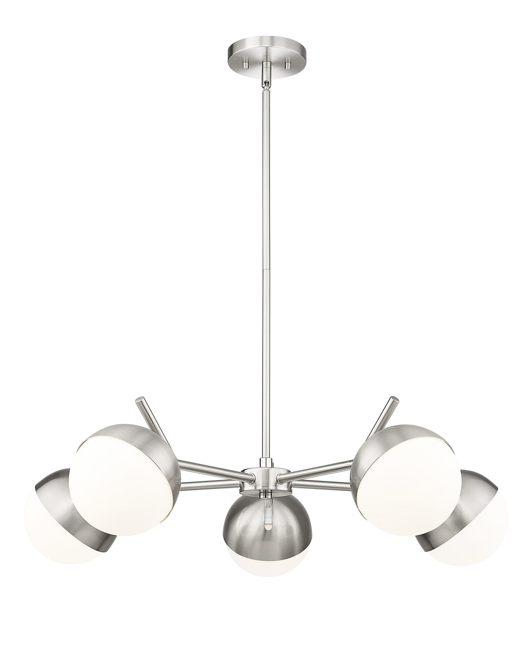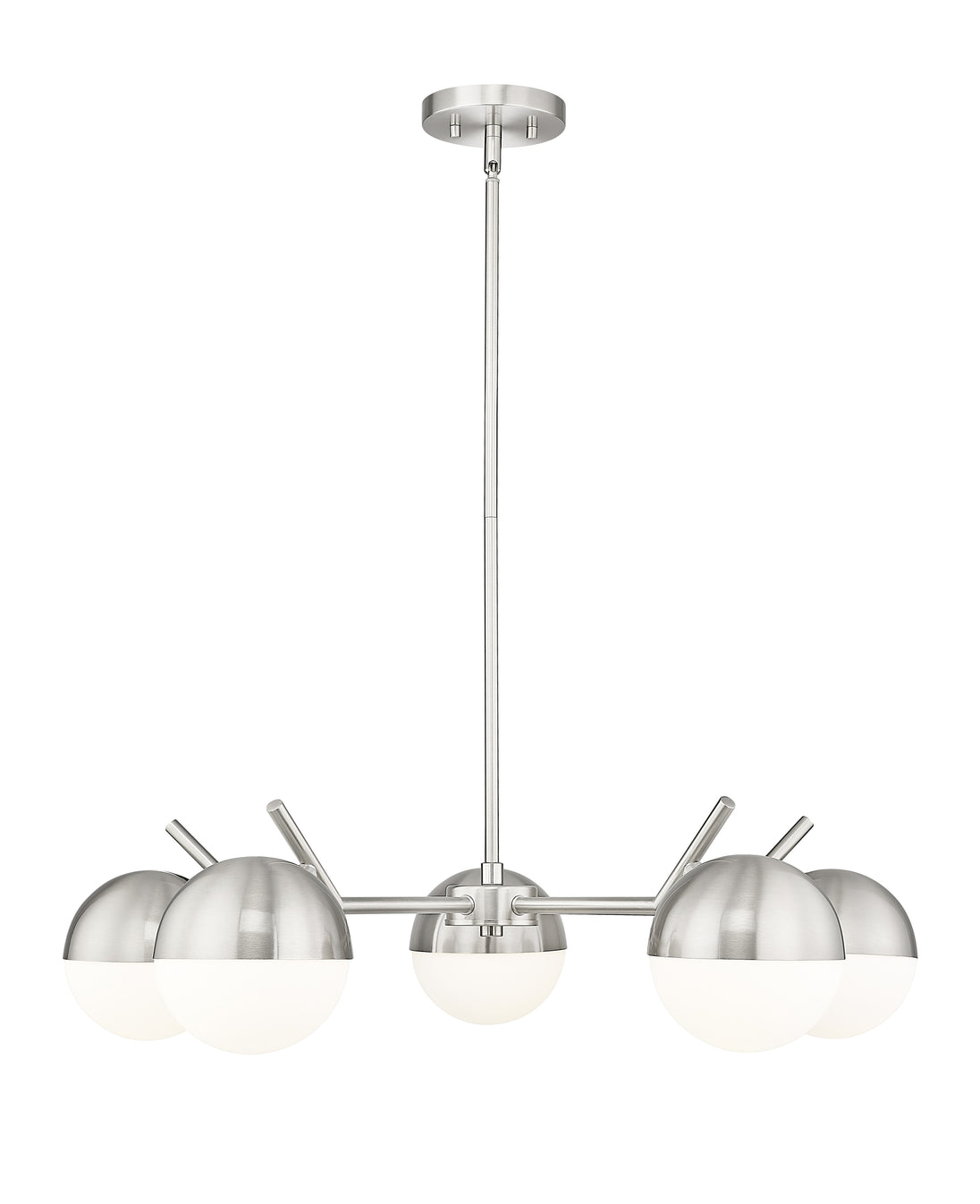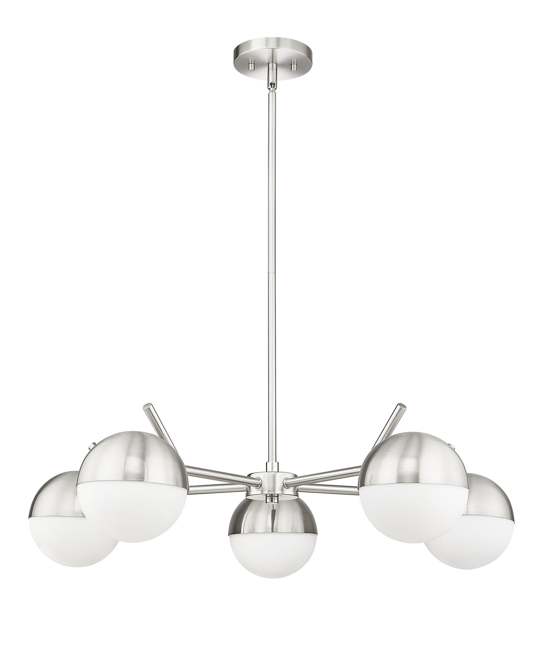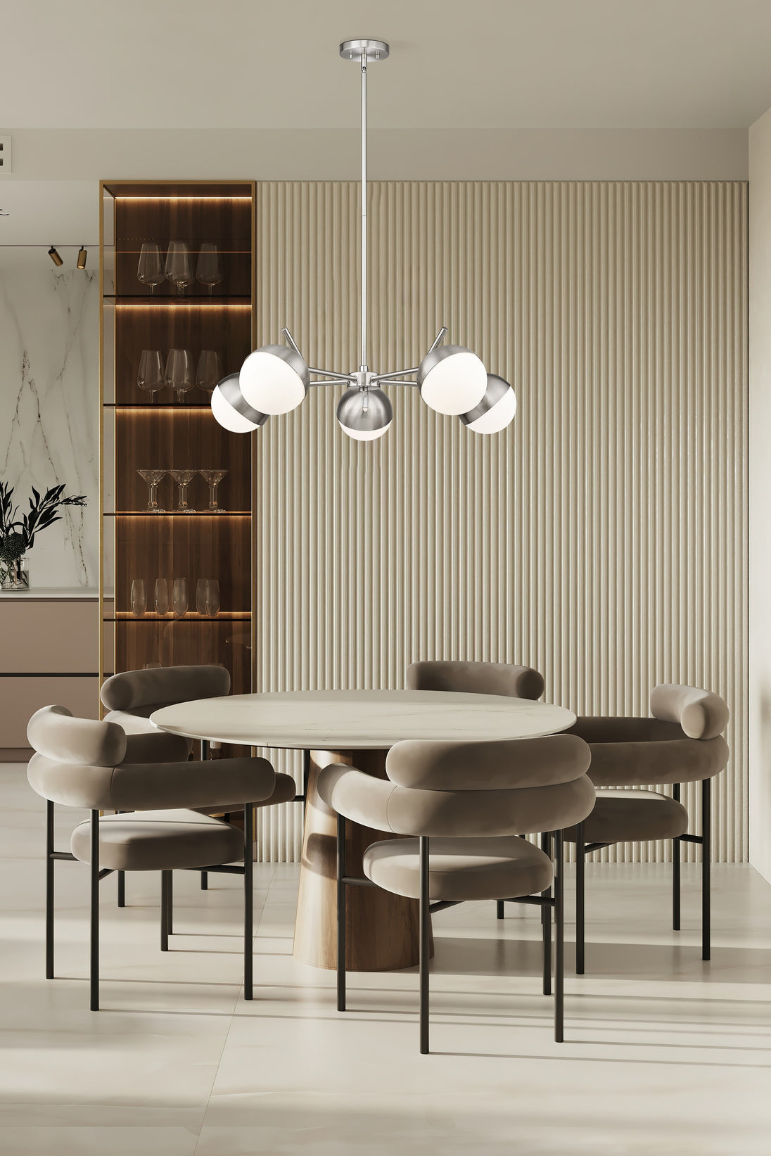 A radiant configuration of angular arms in a sleek brushed nickel finish create a compelling style for this modern five-light chandelier. Striking over a dining table or other gathering space, it features a clean, straight-lined silhouette and is complete with opal glass orb shades for inviting illumination.