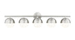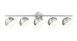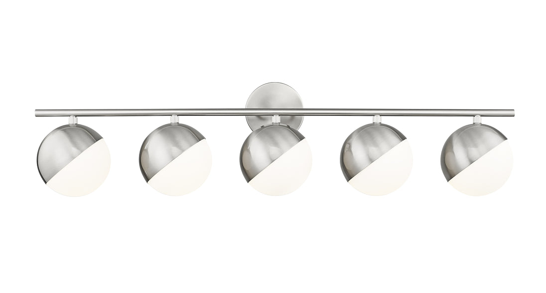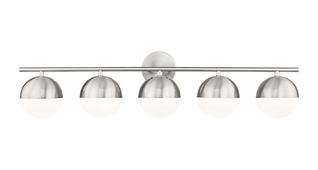 Light a large en suite with the impressive span of this mid-century five-light vanity bath light. Perfect for bright, glare-free illumination, it features orbs shades of matte opal glass, complete with metal shields for a clean, fresh look and feel. A brushed nickel finish adds sleek sophistication.